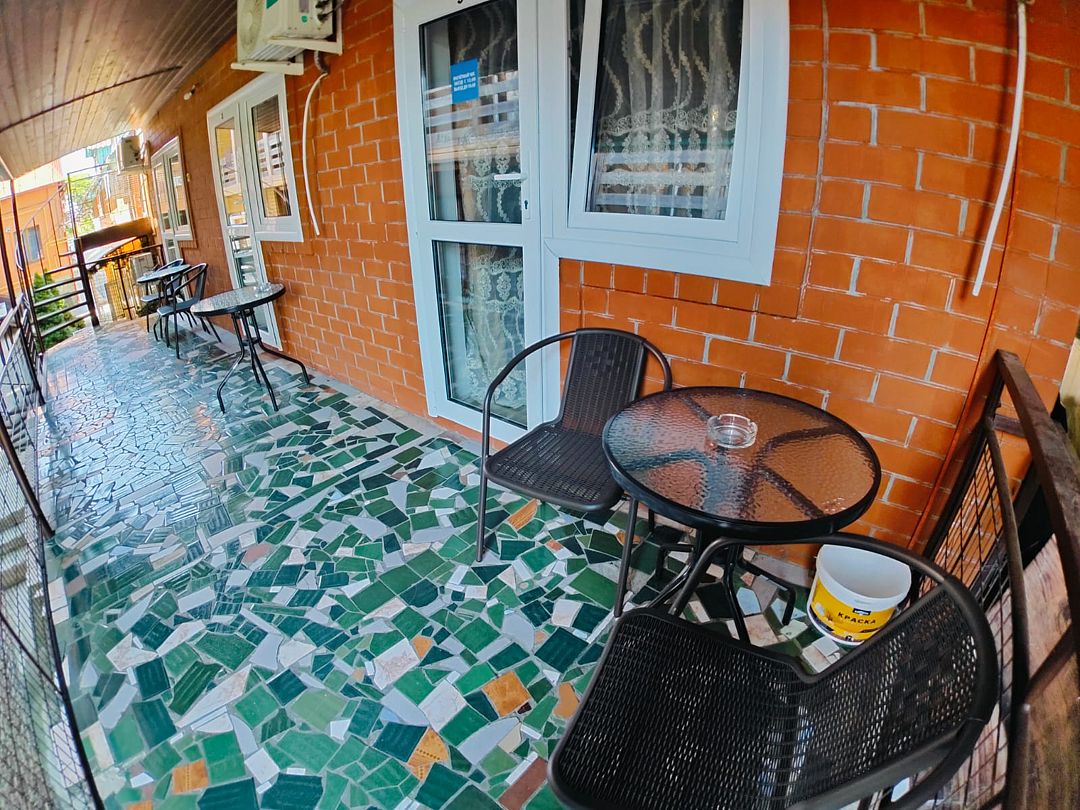 Уютный однокомнатный номер для 2 гостей, площадью 12 кв. м на 1 этаже, общая терраса на 3 номера, возле номера столик.
