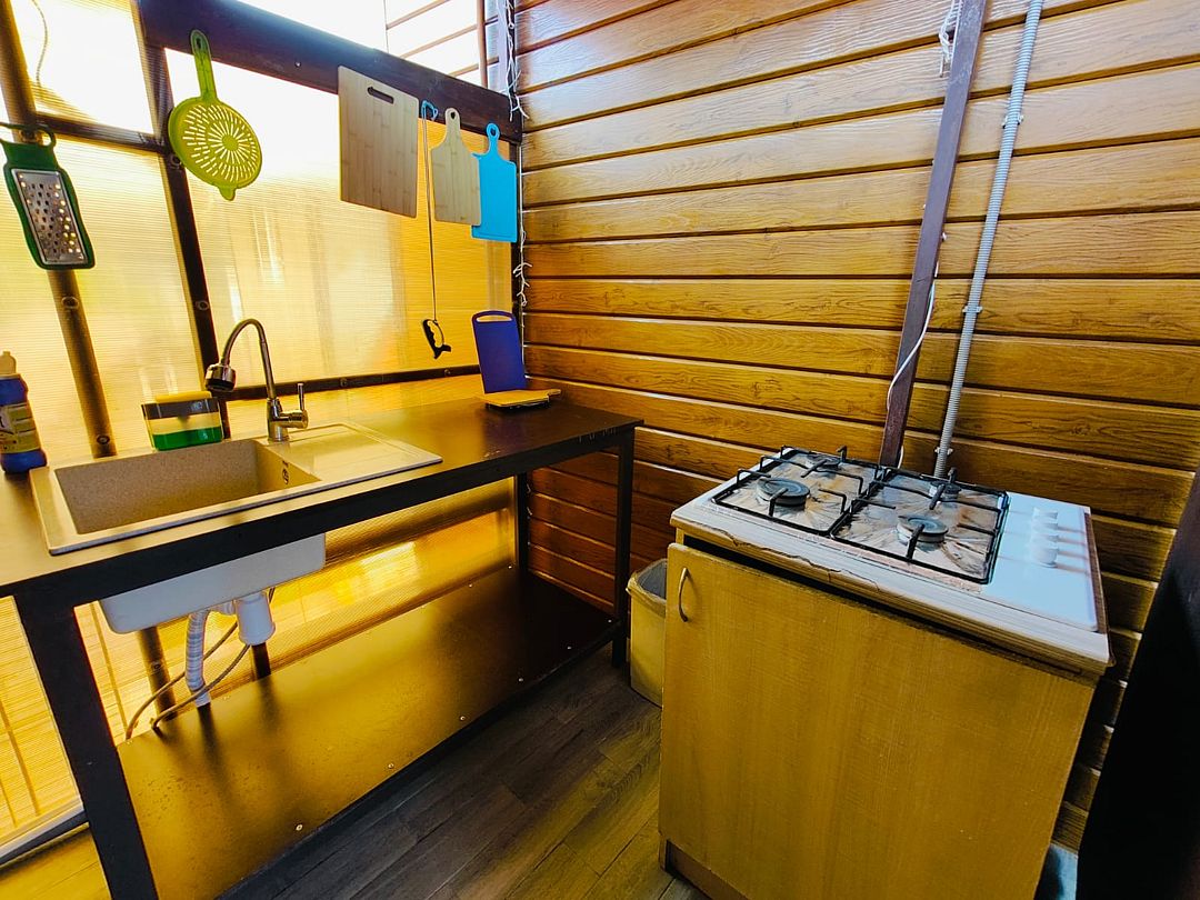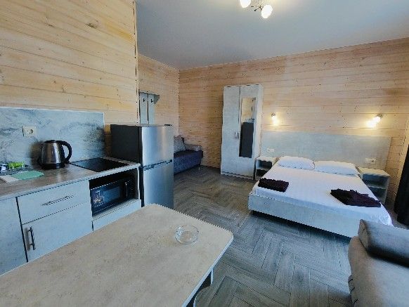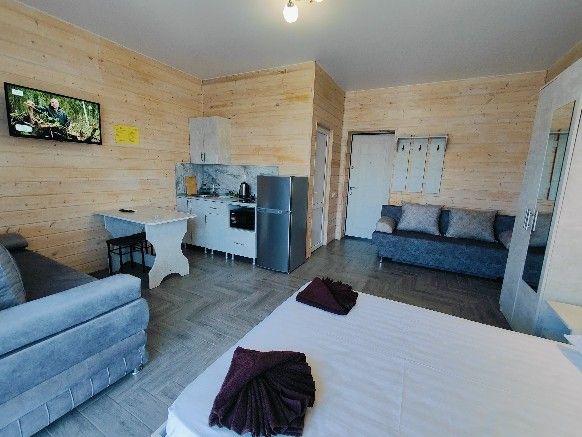 В номере есть все необходимое: кухонная зона, двуспальная кровать 1,4 м и диван-кровать 1.4 м, шкаф, прикроватная тумба, стол, TV, холодильник, сплит-система, фен, чайник, микроволновая печь, варочная панель, набор посуды, набор полотенец, совмещённый санузел и косметика для ванны. В стоимость номера включено: бассейн с подогревом 4х8 с детской зоной, шезлонги, зона барбекю и столики, детская площадка, анимация для детей — летом, Wi-Fi, кухни для самостоятельного приготовления.