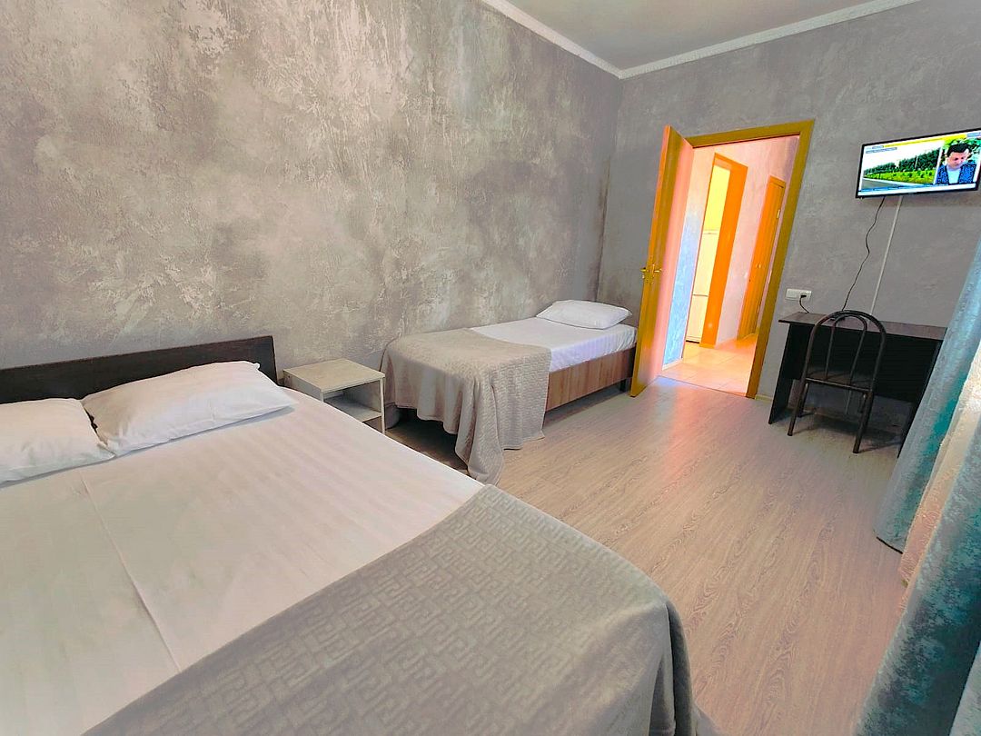 В номере есть все необходимое: 2 односпальные кровати, одна двуспальная кровать ,шкаф, прикроватная тумба, письменный стол, посуда на каждого гостя . TV, сплит-система, набор посуды, набор полотенец, совмещённый санузел рядом в коридоре. В стоимость номера включено: бассейн с подогревом 4х8 с детской зоной, шезлонги, зона барбекю и столики, детская площадка, анимация для детей — летом, Wi-Fi, кухни для самостоятельного приготовления.