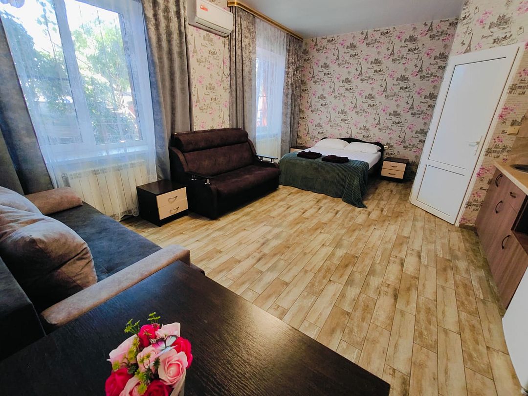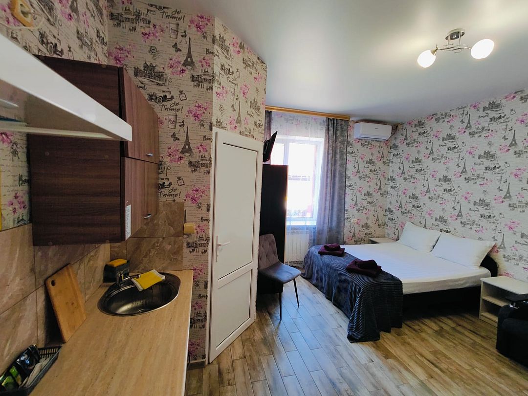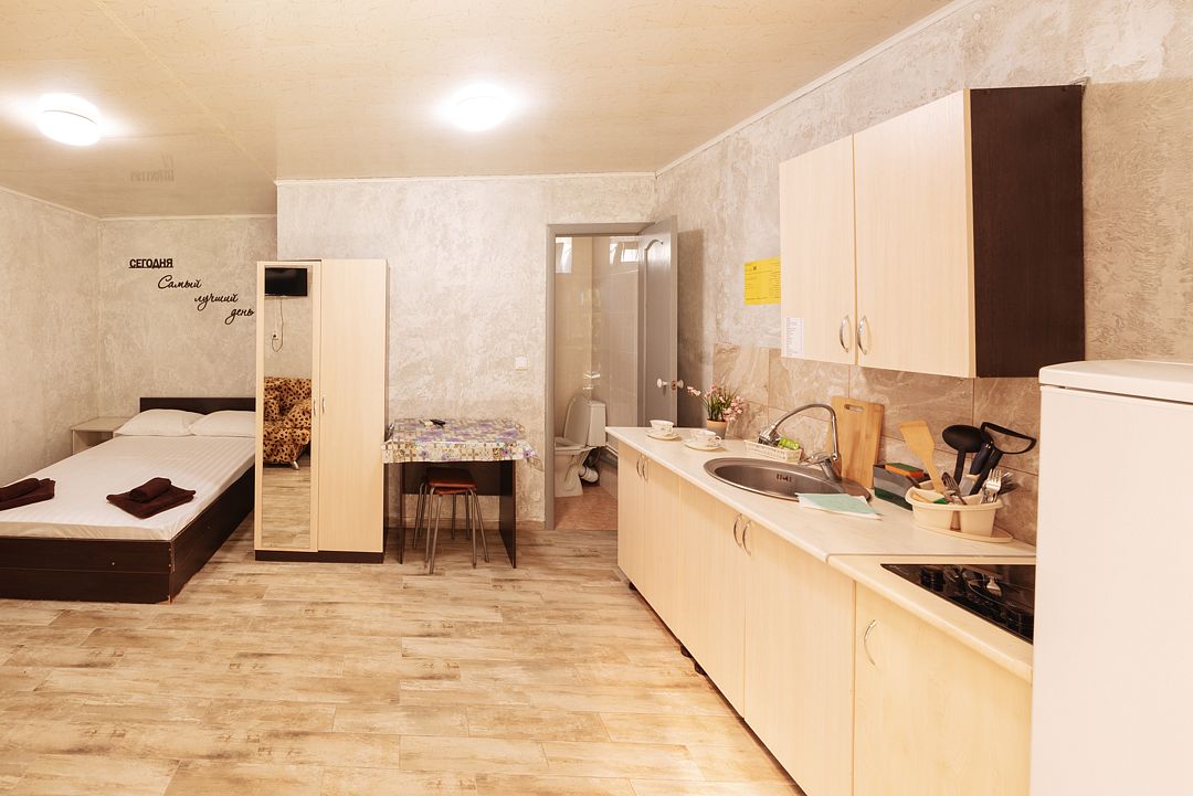 Уютный однокомнатный номер с кухней для 4-6 гостей, площадью 25 кв. м на 1 этаже, вход по коридору.