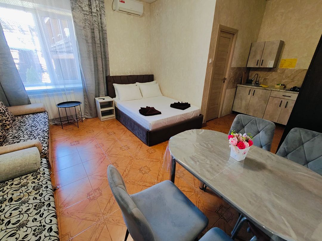В номере есть все необходимое: кухонная зона, двухспальная кровать 1,4 м и диван-кровать 1.4 м, шкаф, прикроватная тумба, стол, TV, холодильник, сплит-система, фен ,чайник, микроволновая печь, варочная панель, набор посуды, набор полотенец, совмещённый санузел и косметика для ванны. В стоимость номера включено: бассейн с подогревом 4х8 с детской зоной, шезлонги, зона барбекю и столики, детская площадка, анимация для детей — летом, Wi-Fi, кухни для самостоятельного приготовления.