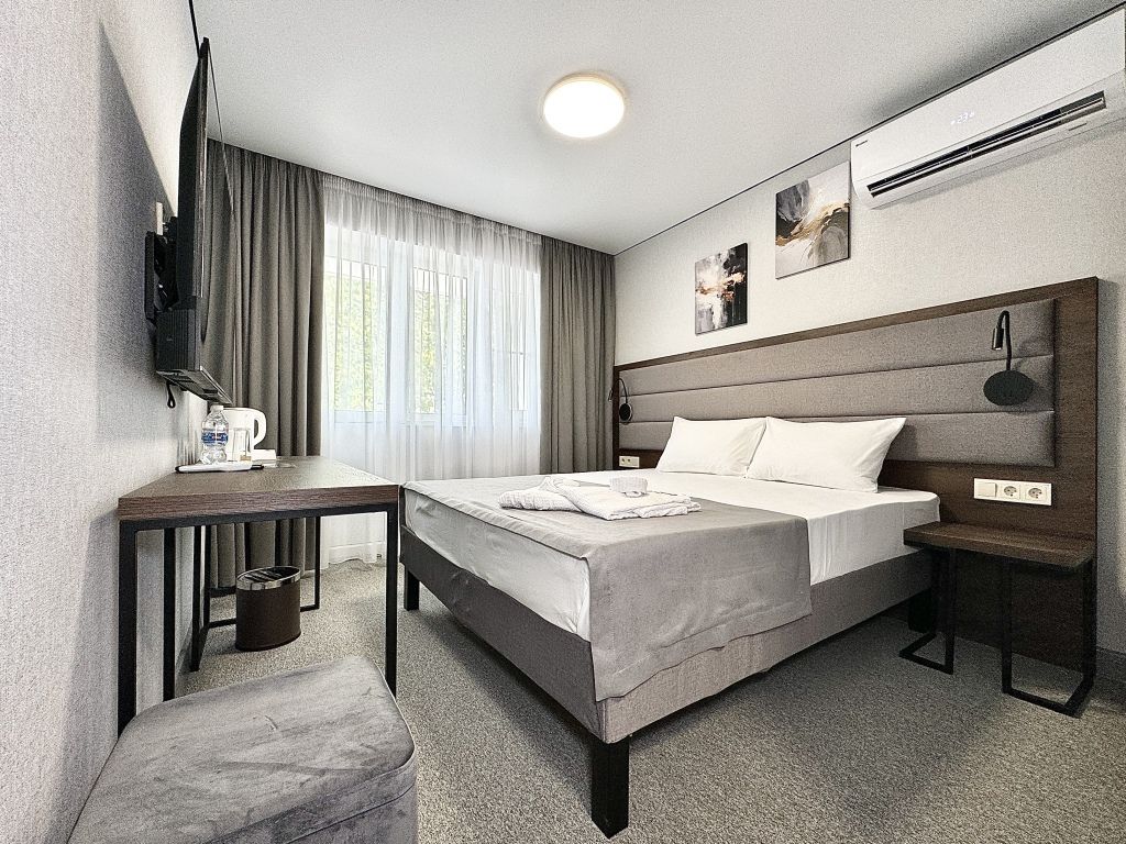 Двухместный номер категории "Стандарт" Данная категория номера состоит из одной комнаты. В комплектацию входит одна двуспальная кровать, 2 тумбочки, телевизор, кондиционер, мини-холодильник, стол, стул, совместный санузел. В каждом номере имеется уютный балкончик, с которого можно полюбоваться приятным видом.Услуги и удобства