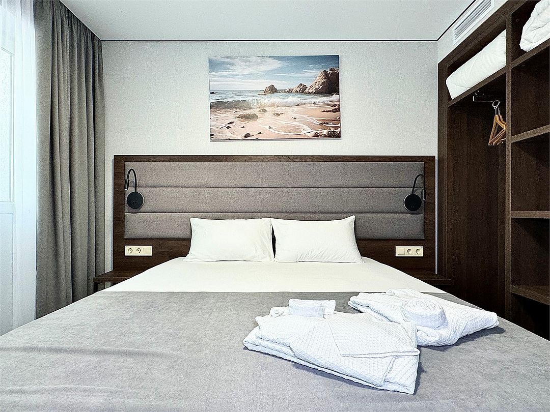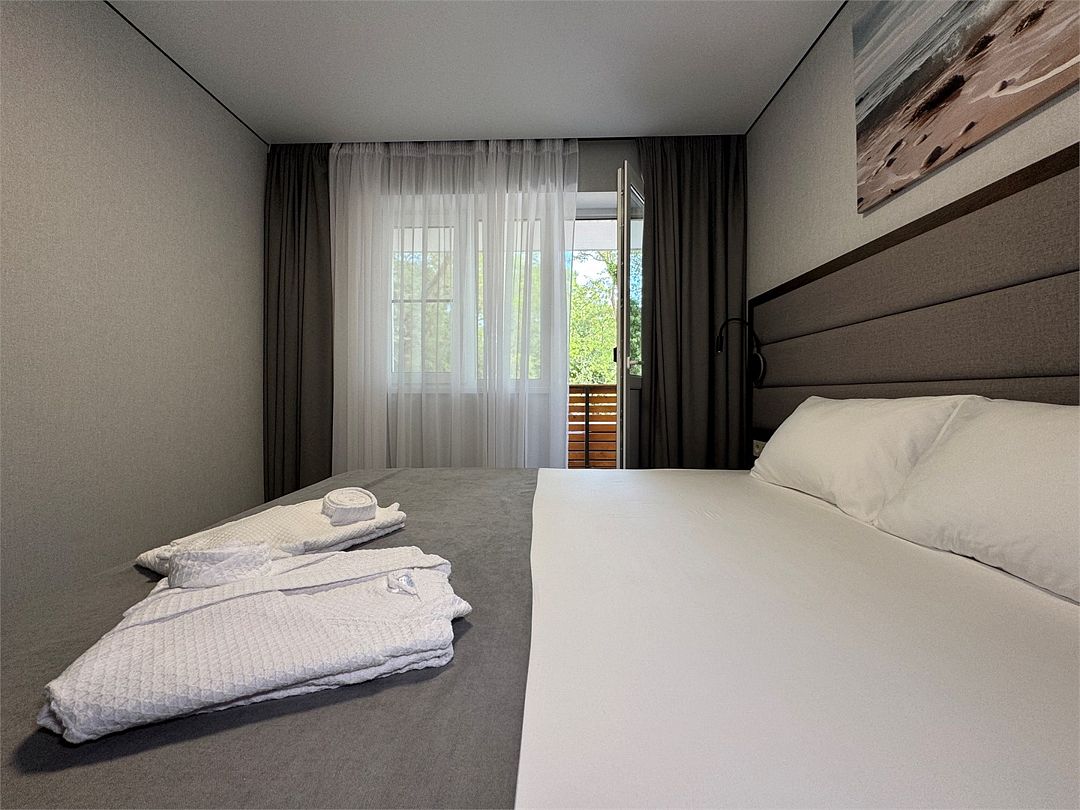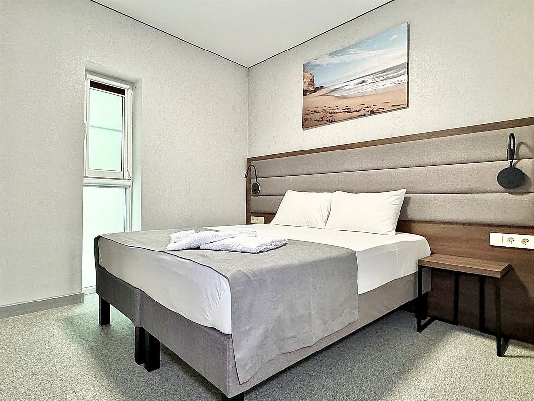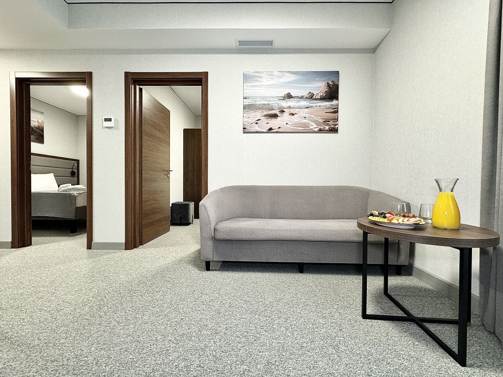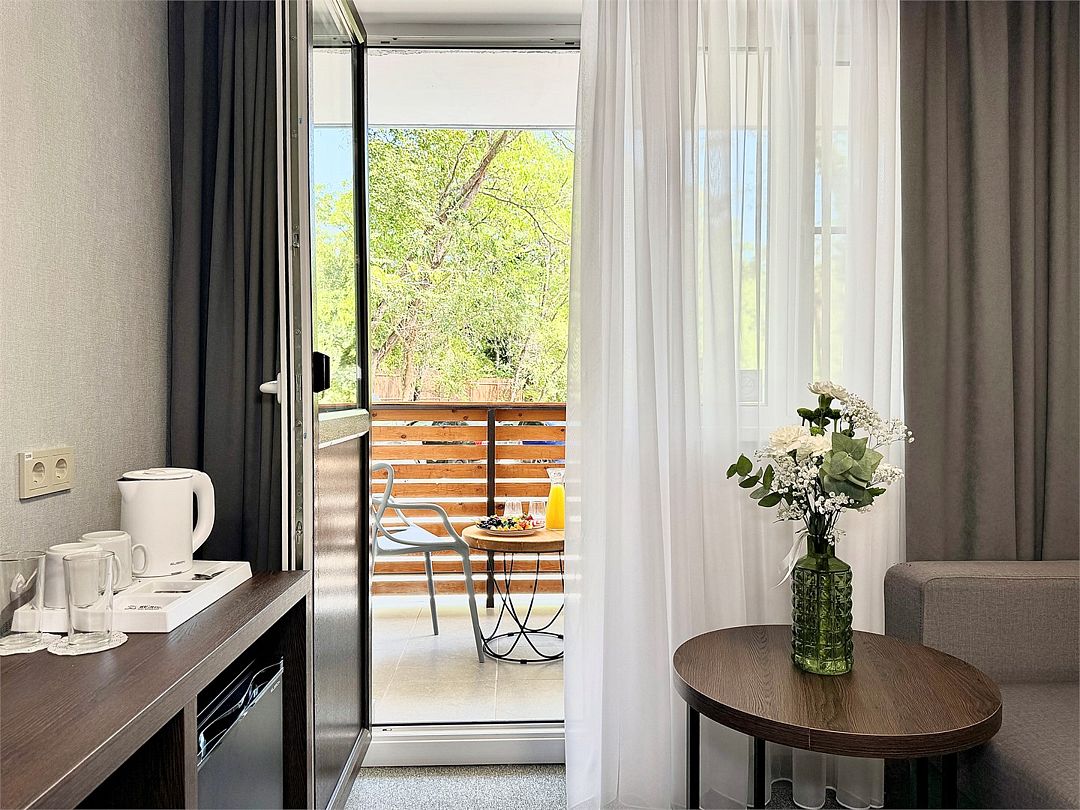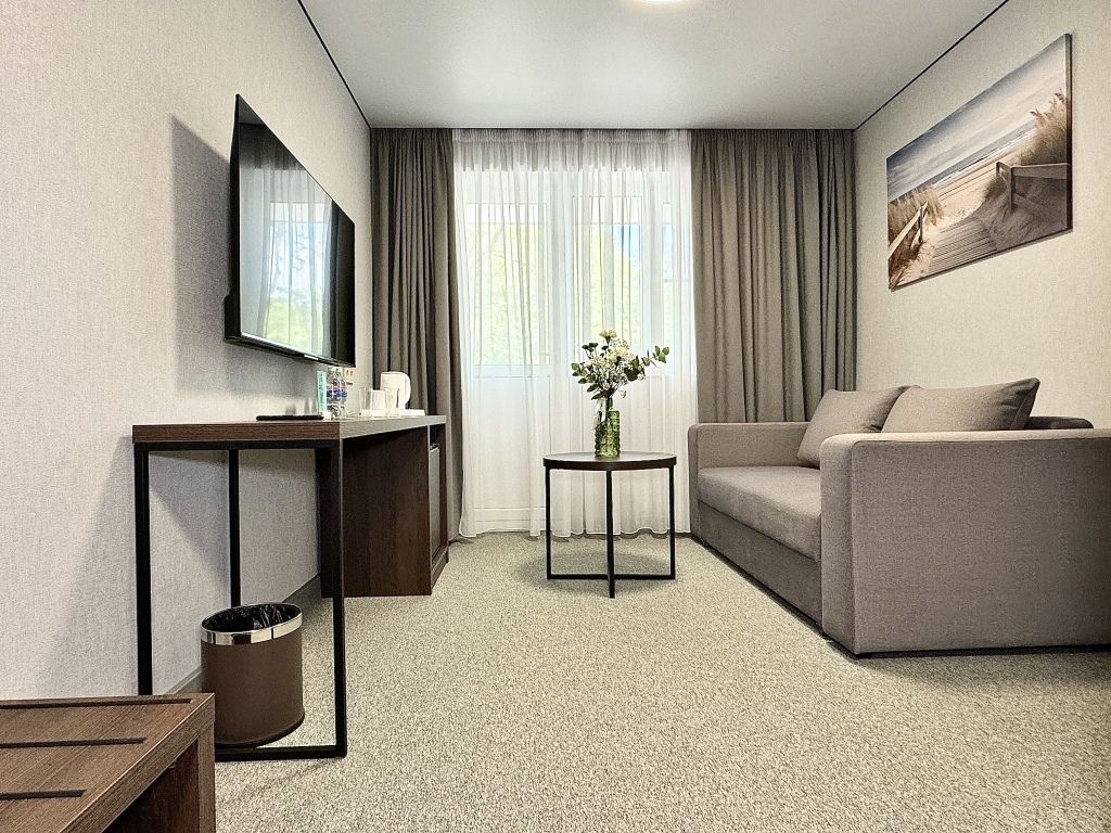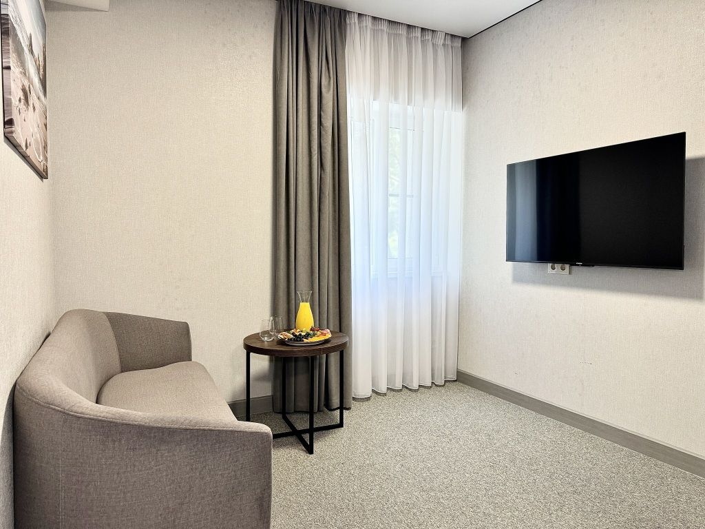 Двухместный номер категории "Джуниор" Данная категория номера состоит из двух комнат. В комплектацию номера входит двуспальная кровать, раскладной диван, 2 тумбочки, открытый шкаф, телевизор, кондиционер, мини-холодильник, журнальный столик, стул, совместный санузел. В каждом номере имеется небольшой уютный балкончик.Услуги и удобства