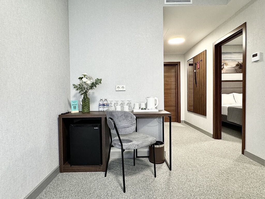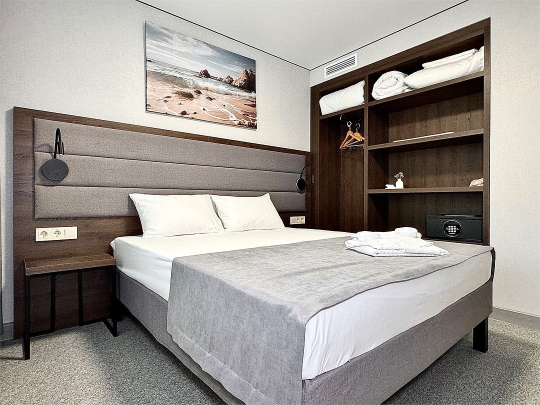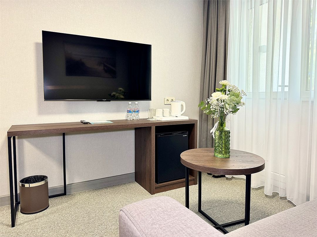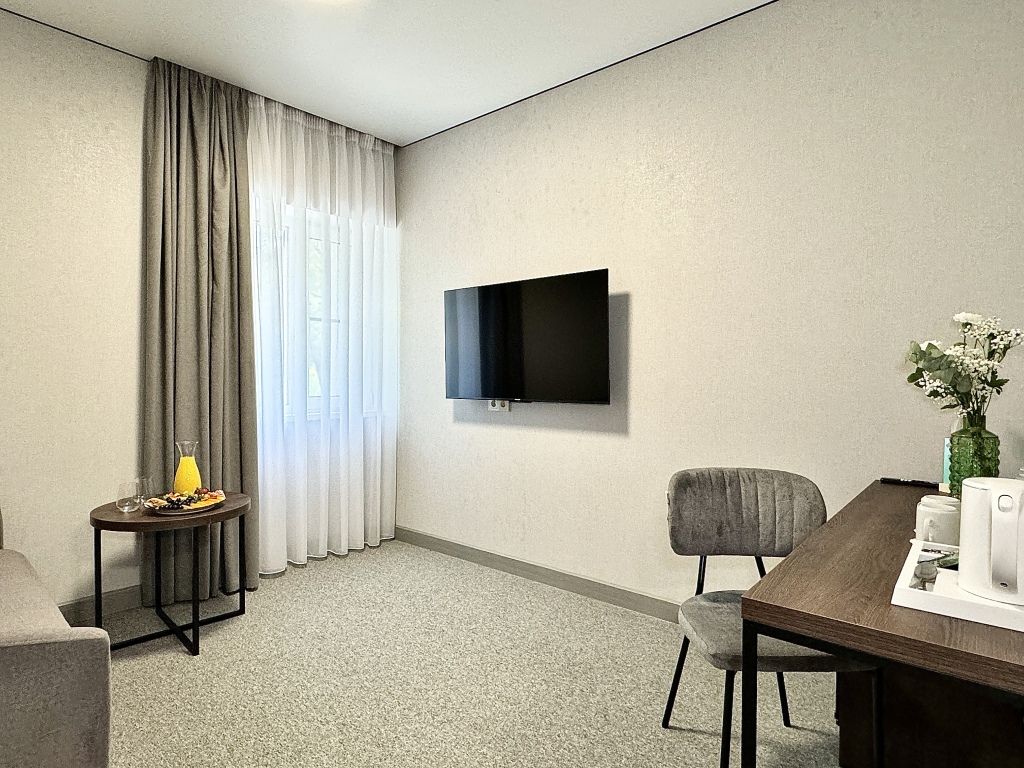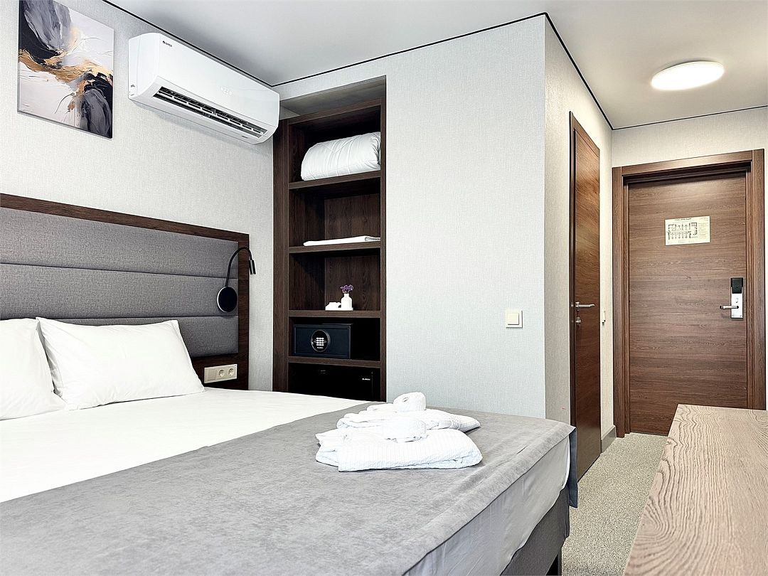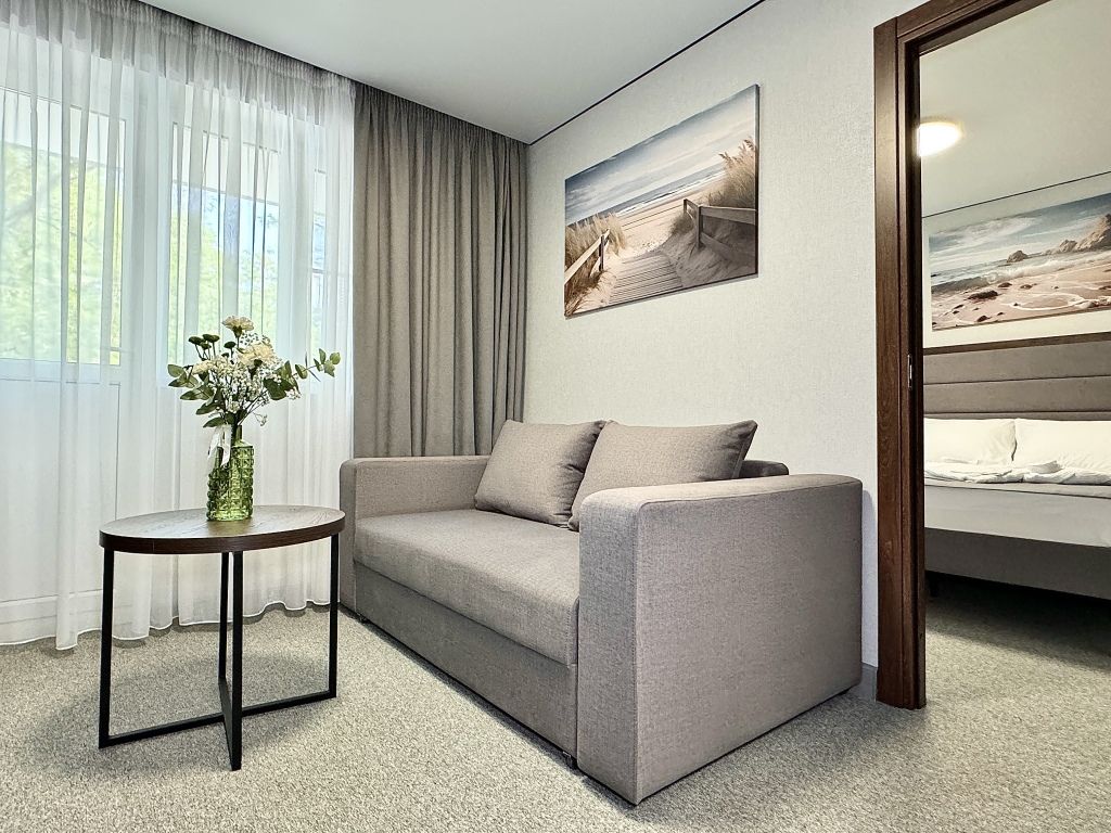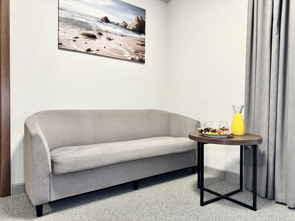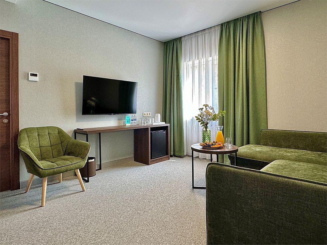 Двухместный номер категории "Джуниор" Данная категория номера состоит из двух комнат. В комплектацию номера входит двуспальная кровать, раскладной диван, 2 тумбочки, открытый шкаф, телевизор, кондиционер, мини-холодильник, журнальный столик, стул, совместный санузел. В каждом номере имеется небольшой уютный балкончик.Услуги и удобства