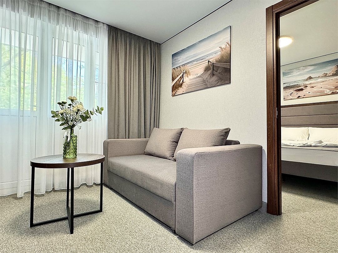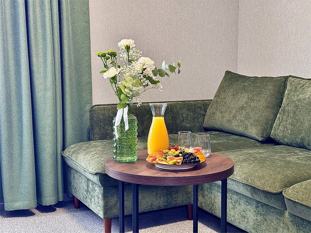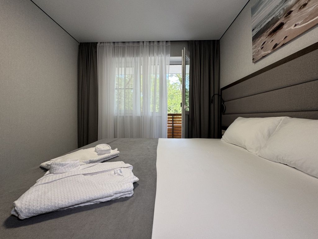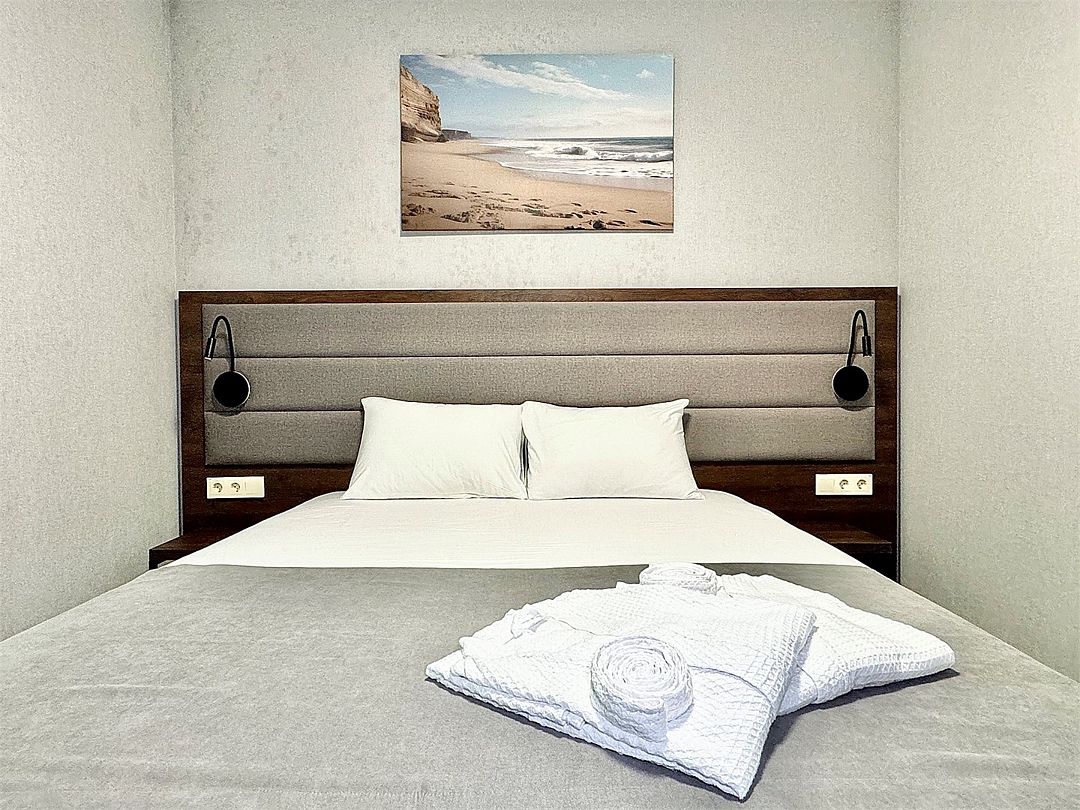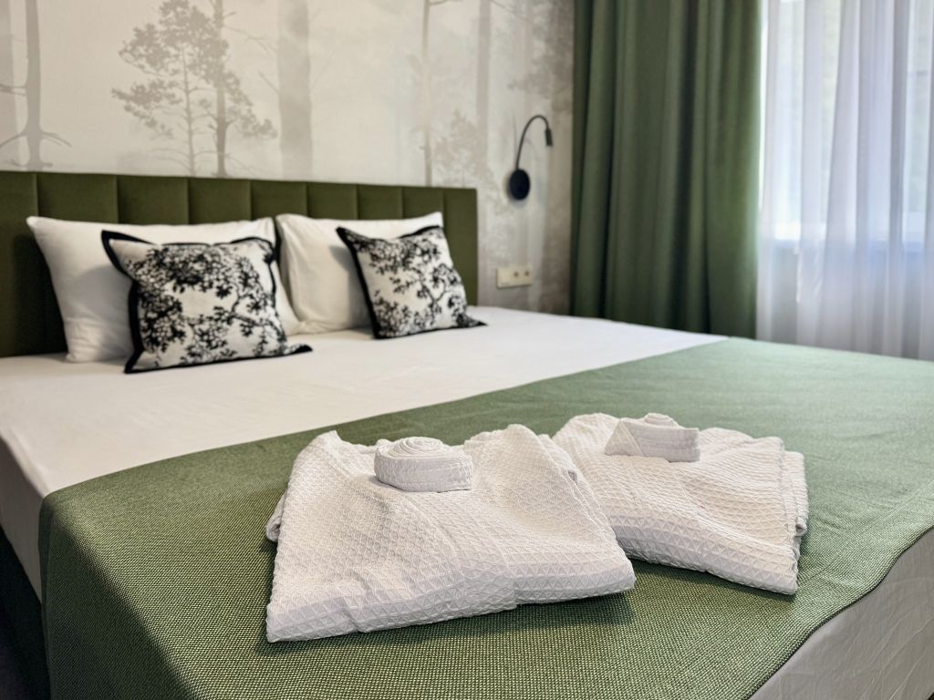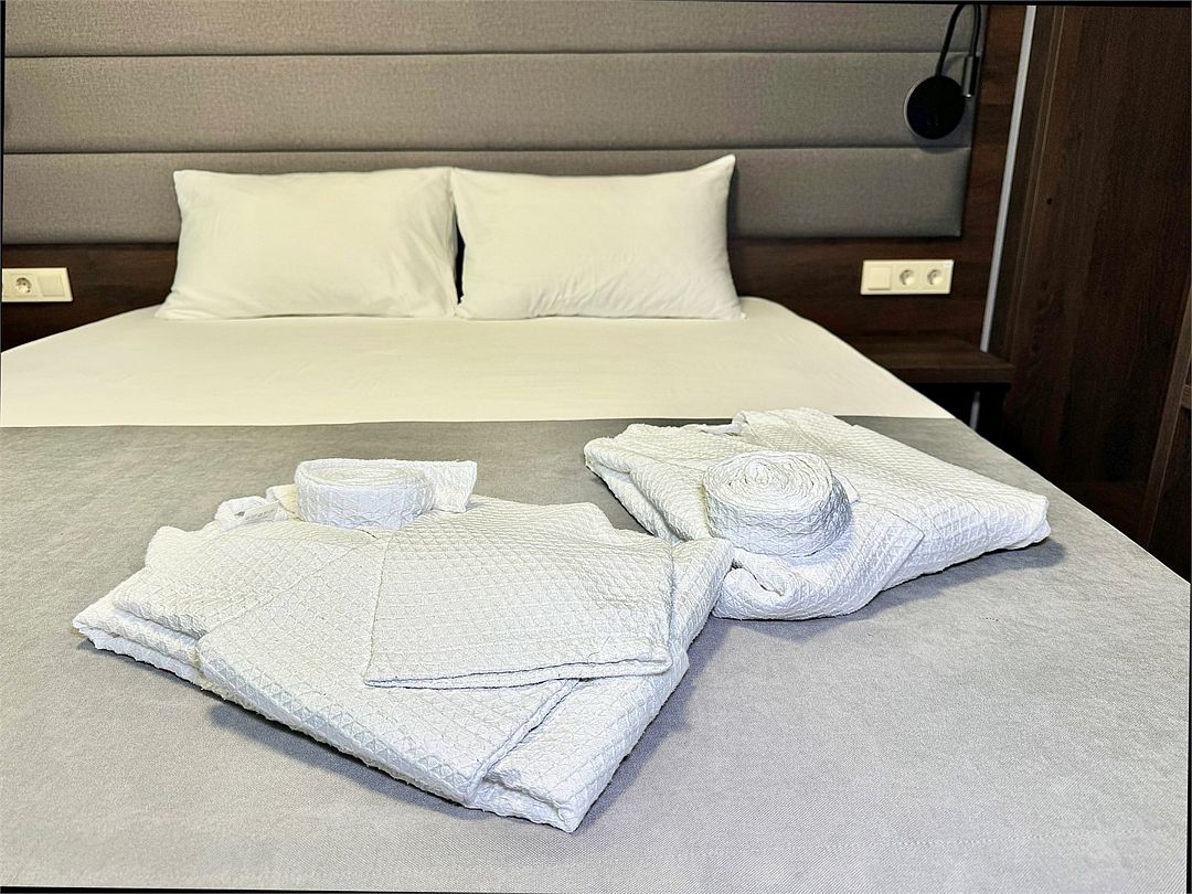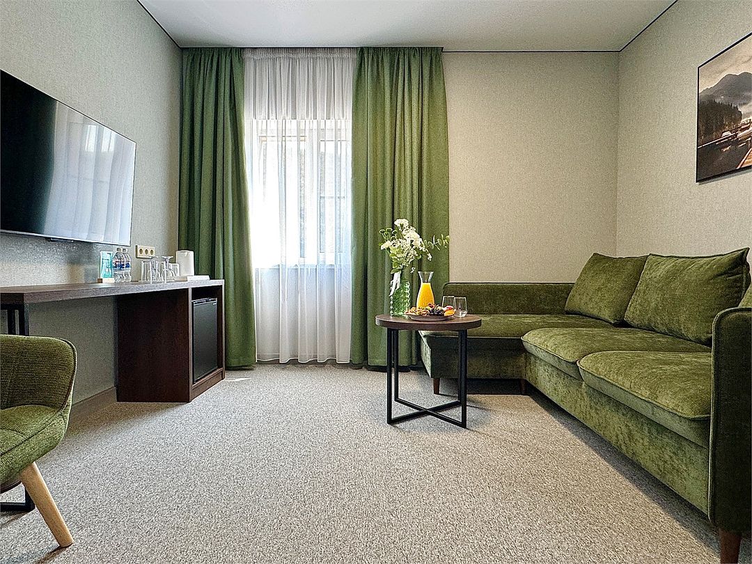 Двухместный номер категории "Джуниор" Данная категория номера состоит из двух комнат. В комплектацию номера входит двуспальная кровать, раскладной диван, 2 тумбочки, открытый шкаф, телевизор, кондиционер, мини-холодильник, журнальный столик, стул, совместный санузел. В каждом номере имеется небольшой уютный балкончик.Услуги и удобства