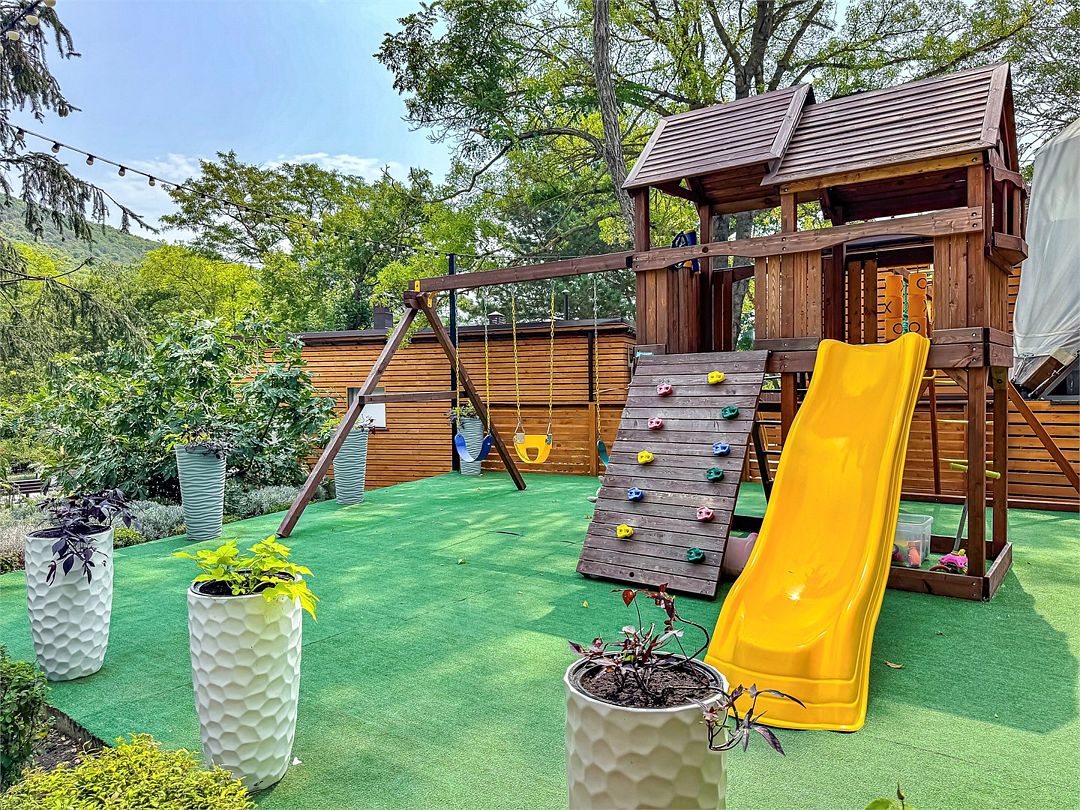Детская площадка расположена около ресторана.