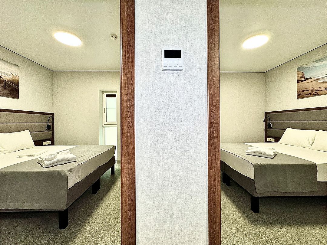 Семейный четырехместный номер. Данная категория номера состоит из трех комнат. В комплектацию номера входит четыре кровати (полуторки), четыре тумбочки, комод, плательный шкаф, телевизор, кондиционер, холодильник.Услуги и удобства