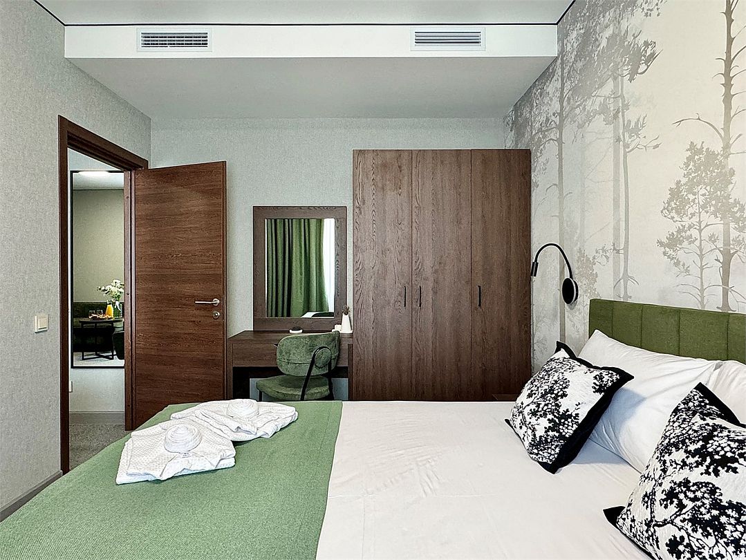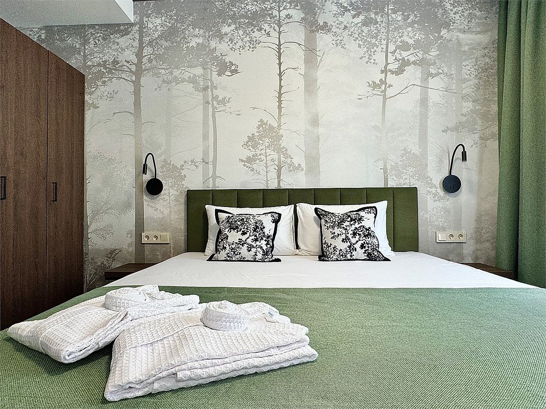 Wi-Fi, холодильник, кондиционер, фен, плита для приготовления пищи, микроволновая печь, санузел, теплый пол, банные принадлежности, халаты, банные полотенца, пляжные полотенца, тапочки, косметические средства, терраса, двуспальная кровать, диван, кресла, вешалки, обеденный стол, две комнаты, кухня, набор посуды, обслуживание номеров, информационная карта, меню, чайник, раковина, мягкая мебель, отопление, душ, плиточное покрытие, кресло, раздельный санузел, тостер, кухонная посуда, стаканы, кухонная утварь, столовые приборы, стул, стол, туалетные средства, туалет, панорамные окна, вид на горы, телевизор со Smart TV, теплые полы, номер для некурящих, вид на бассейн, вид на лес, холодильный шкаф, парна́я, фумигатор, межкомнатная дверь, уборка номера, услуги прачечной (платно), бутилированная вода, навес, веранда, шапочка для душа, мыло, затемняющая штора, окна от пола до потолка, не раскладной диван, без питомцев, баняВ гостиничном номере