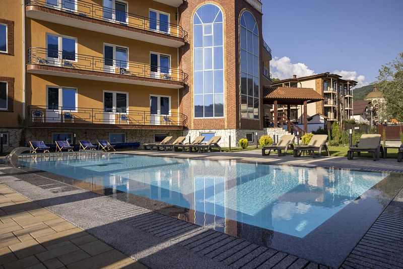 Открытый подогреваемый бассейн с морской водой и бесхлорной фильтрацией, шезлонги.