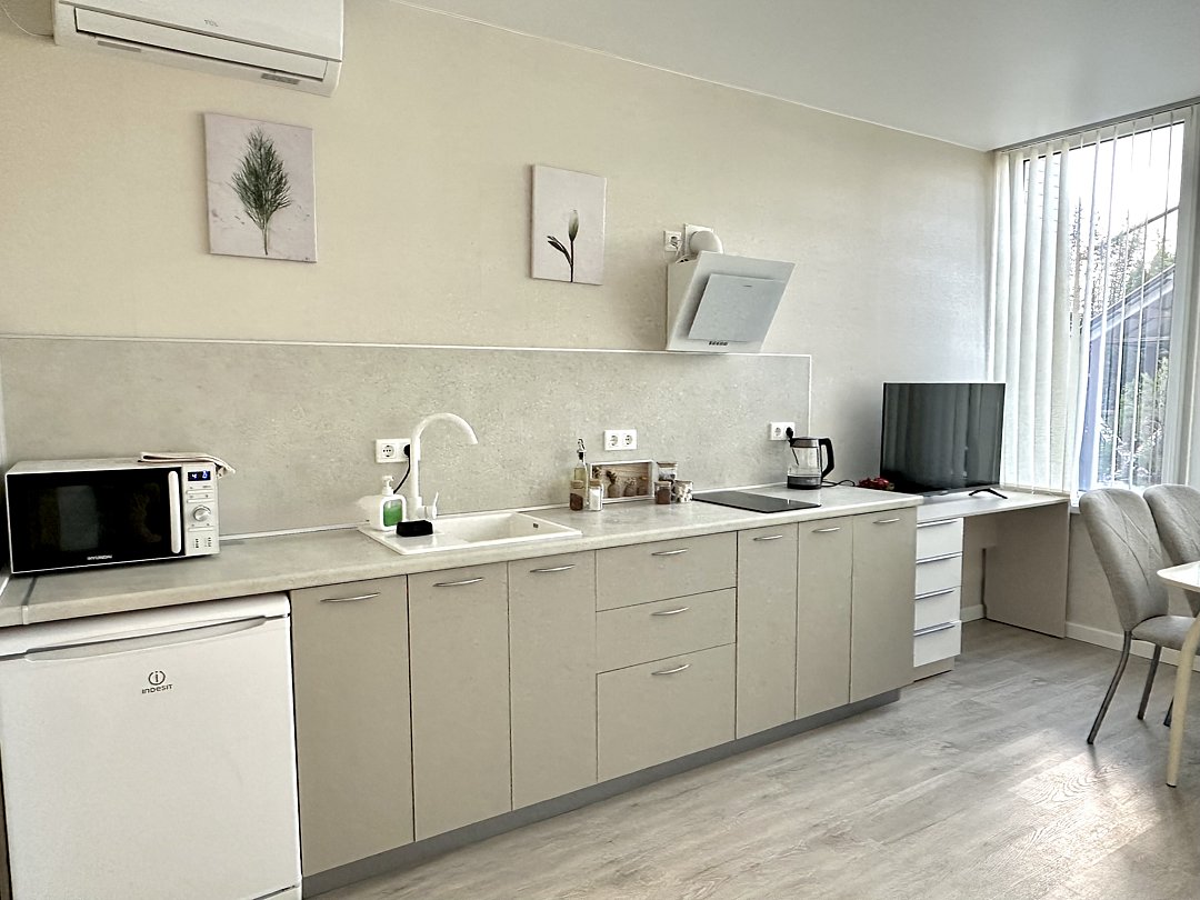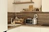 - Оборудованная кухня. Вся необходимая посуда — тарелки, салатники, бокалы, стаканы, кастрюли, сковородки. Ароматный чай и кофе. Масло, соль и специи тоже предусмотрели.