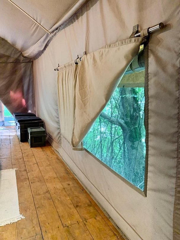 В глэмпинге: ванная комната, удобная кровать (2 односпальные, которые по желанию гостя трансформируются в 1 двуспальную), рабочее место и собственная терраса с двумя креслами-шезлонгами и столиком для уютных чаепитий. Глэмпинг находится в лесу среди деревьев, вечером, сидя на террасе, если повезёт, можно увидеть сову, сидящую на ветке, или филина, пролетающего мимо.