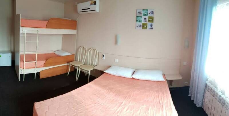 Одна двуспальная кровать, одна двухъярусная кроватьВ гостиничном номере