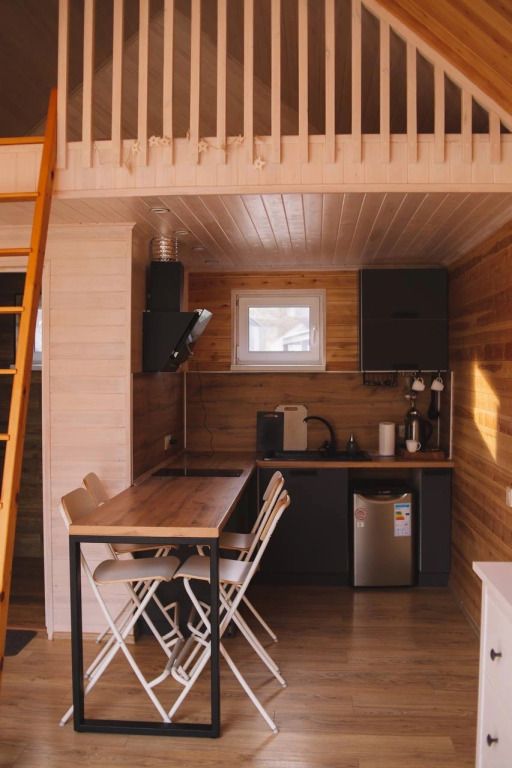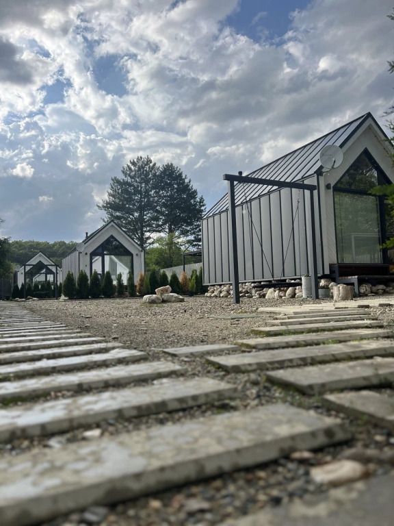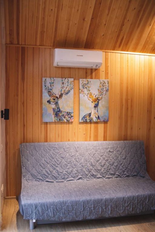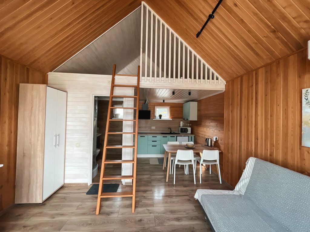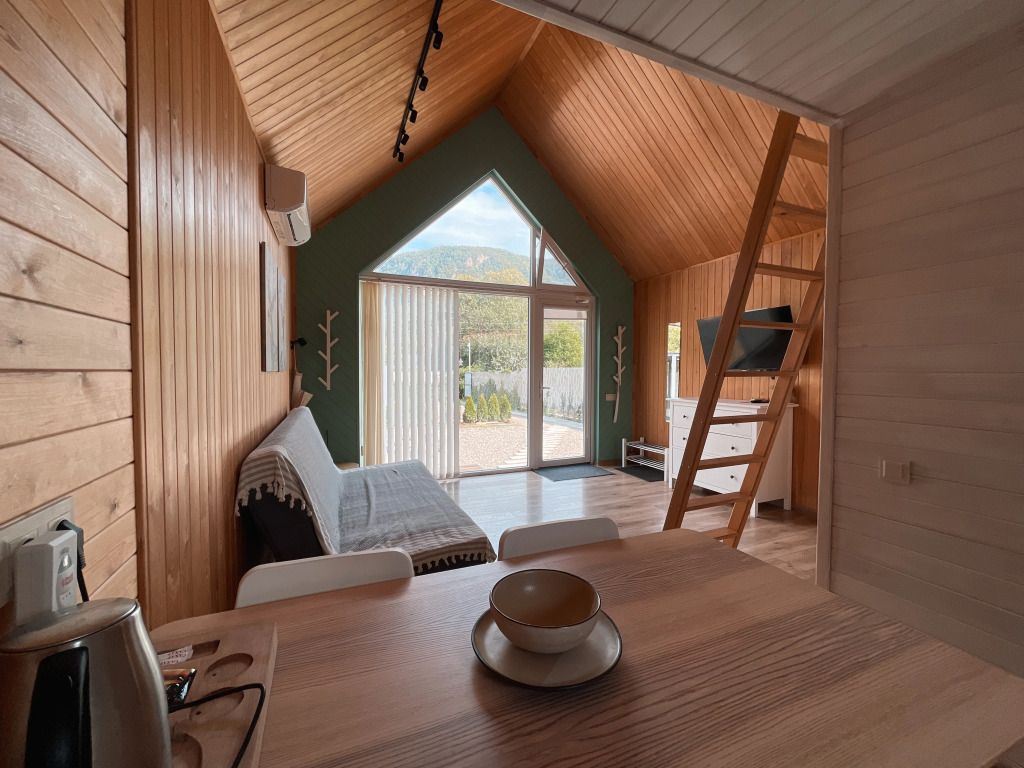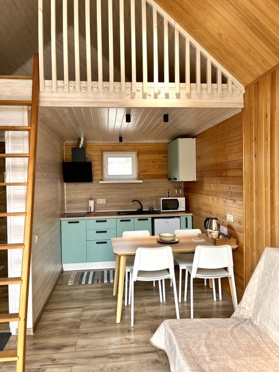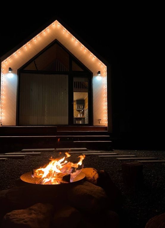 Коттедж оборудован необходимым для проживания на двоих или семью с детьми. Санузел с душевой кабиной, мини-косметика для душа. Предоставляется постельное бельё, полотенца, тапочки. Также есть мангал, беседка на территории каждого домика, зона отдыха у костровой чаши, купель фурако (по запросу).