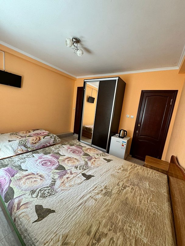 .В номере есть туалет ,душ,телевизор,холодильник,кондиционер,2-х спальная кровать ,две односпальные кровати ,шкаф,стол,чайник ,фен,отопление..В номере