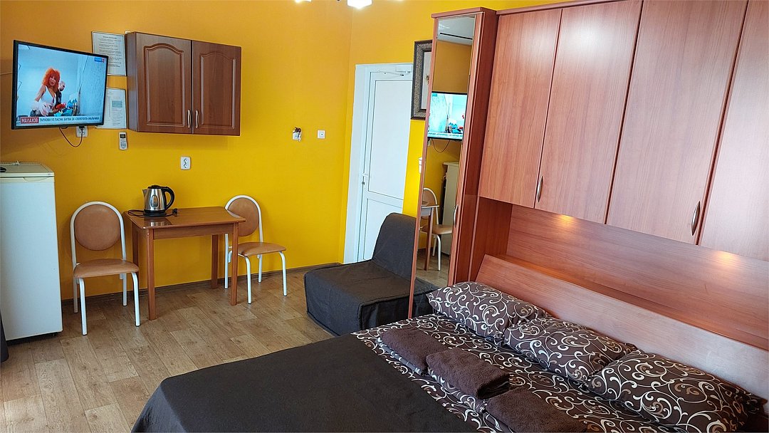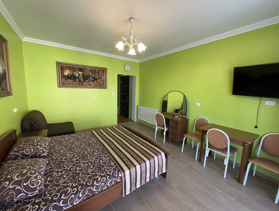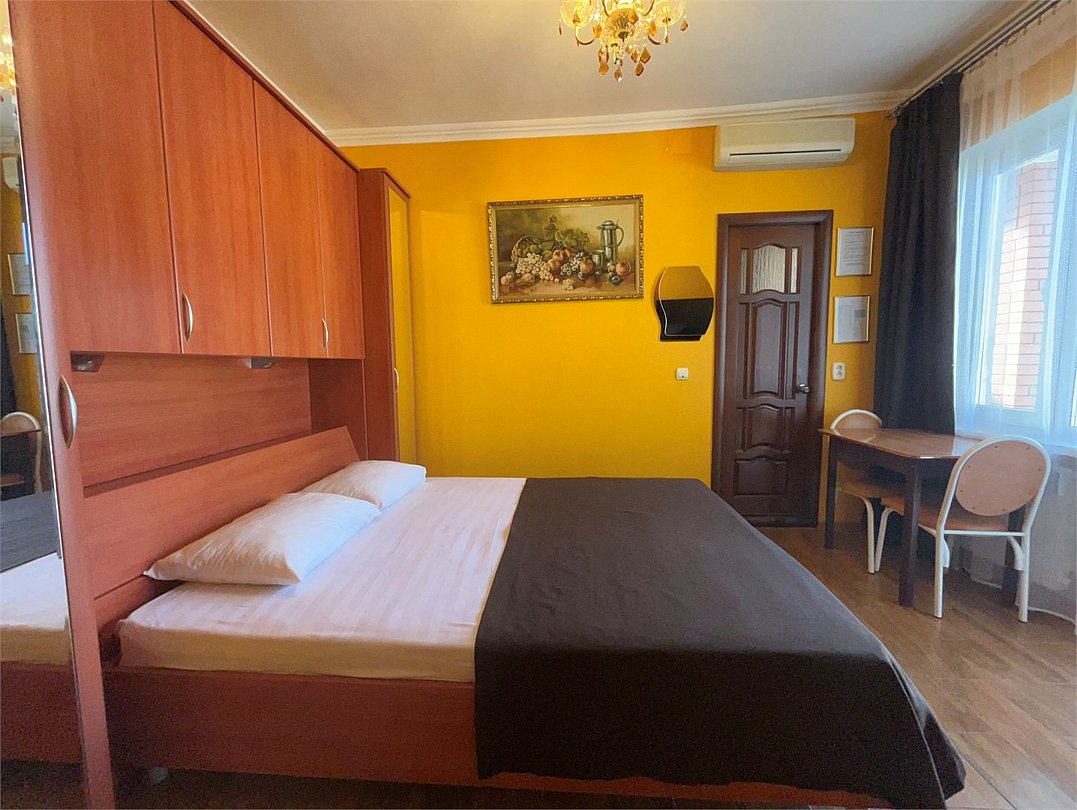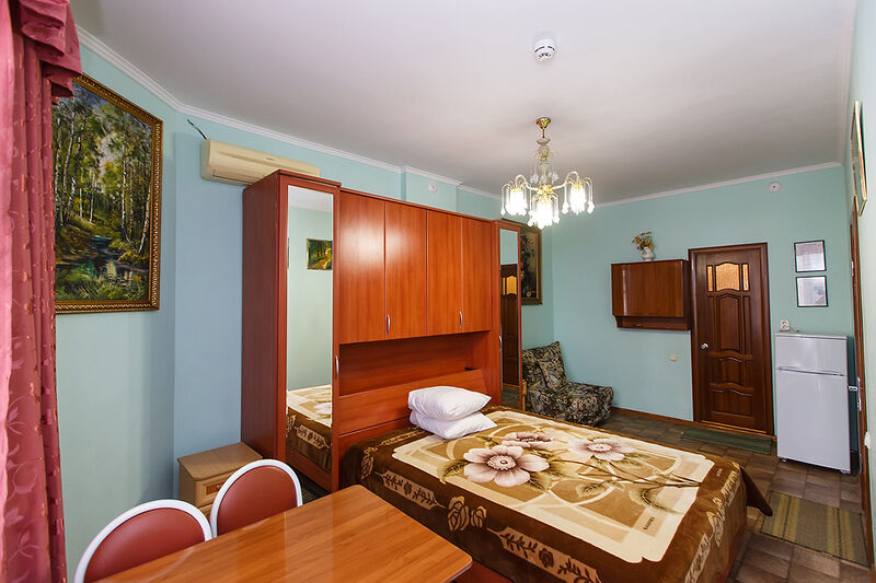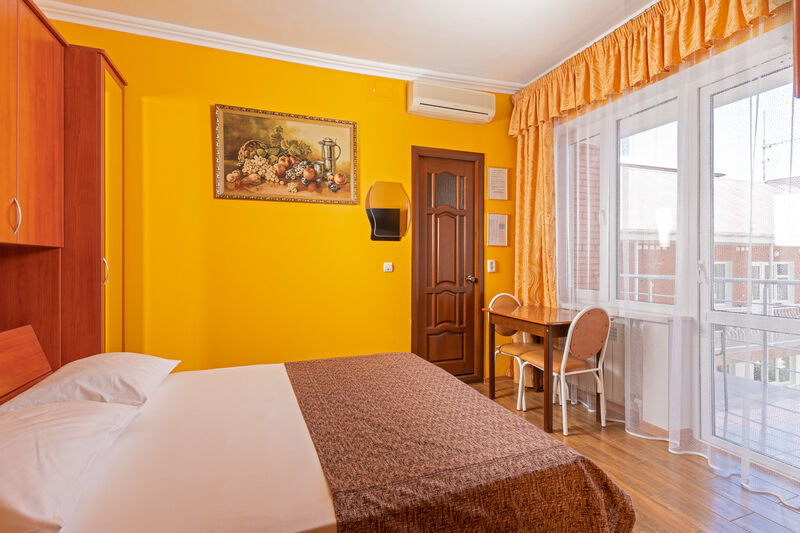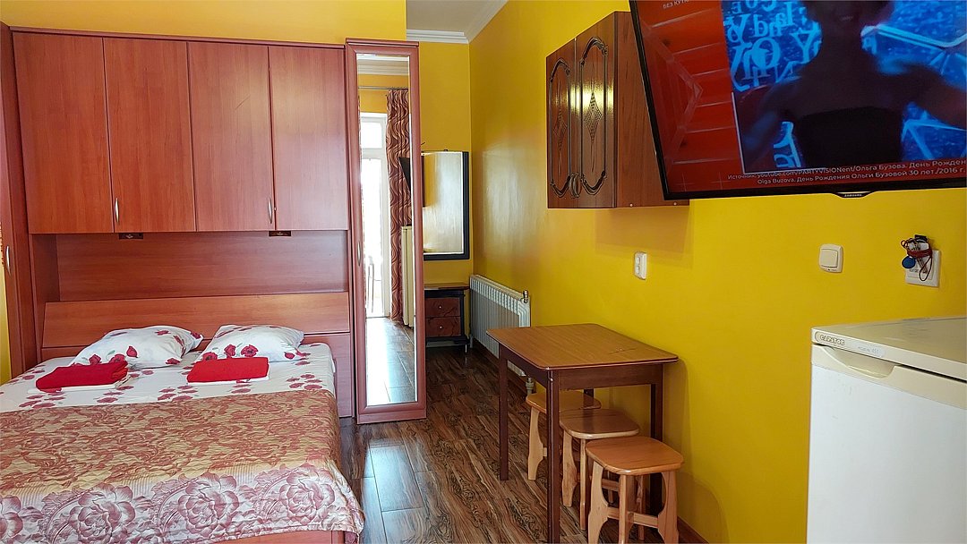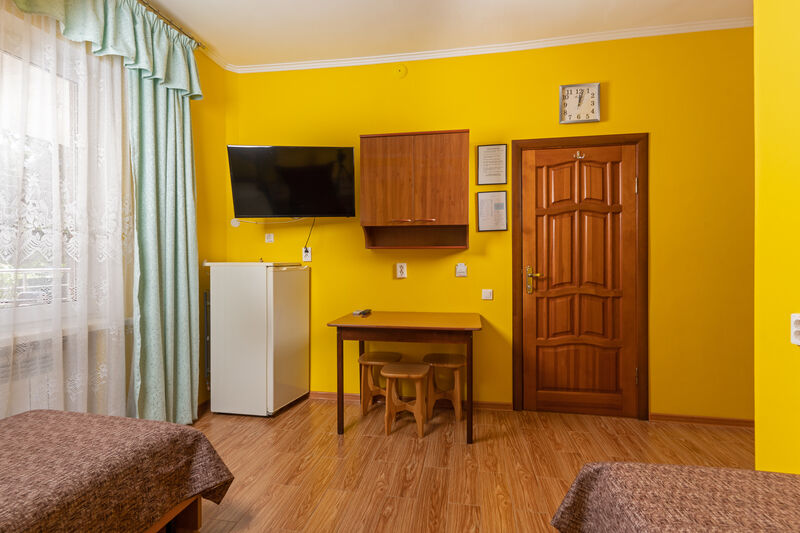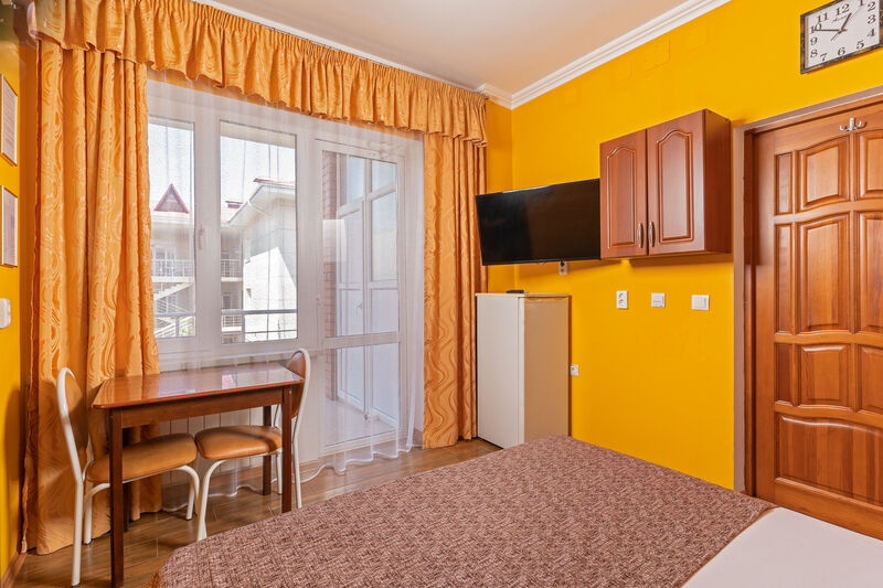Двухместная комната, оформленная в современном стиле. Комфортабельные комнаты категории «Стандарт», рассчитанные на размещение от 1 до 4 человек, цена указана за номер. Обеспечены всем необходимым для полноценного отдыха. Комнаты оснащены: двуспальной кроватью, LCD телевизором, сплит системой, сейфом для удобства хранения ценных вещей, холодильником, отдельным санузлом, посудой и wi-fi. Дополнительные места, комфортабельные кресло - кровать. На каждом этаже есть гладильная доска с утюгом. Для категории Стандарт улучшенный предусмотрены террассы, на которых имеется кухня для самостоятельного приготовления пищи, а так же столы и стулья для того чтоб посидеть на свежем воздухе и насладиться приятным климатом гостеприимного курорта.Услуги и удобства