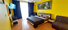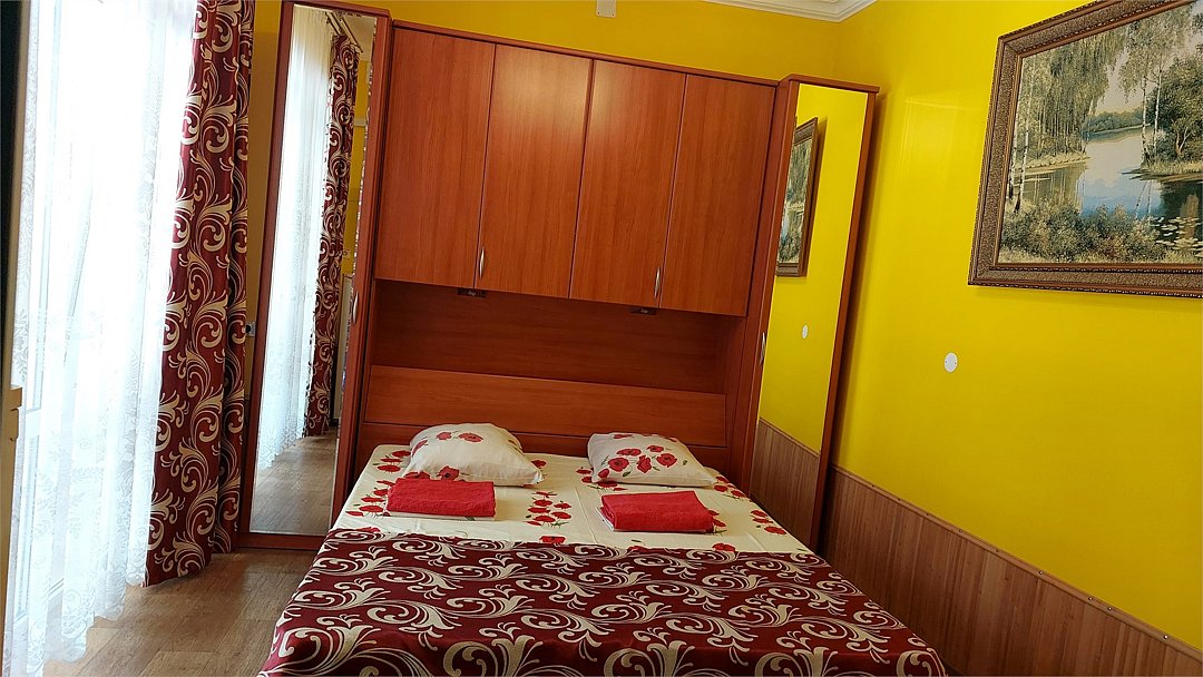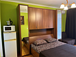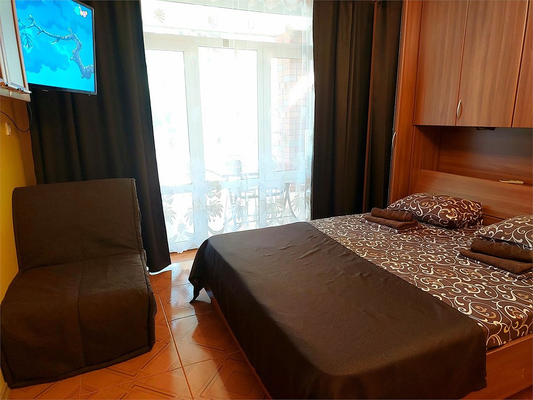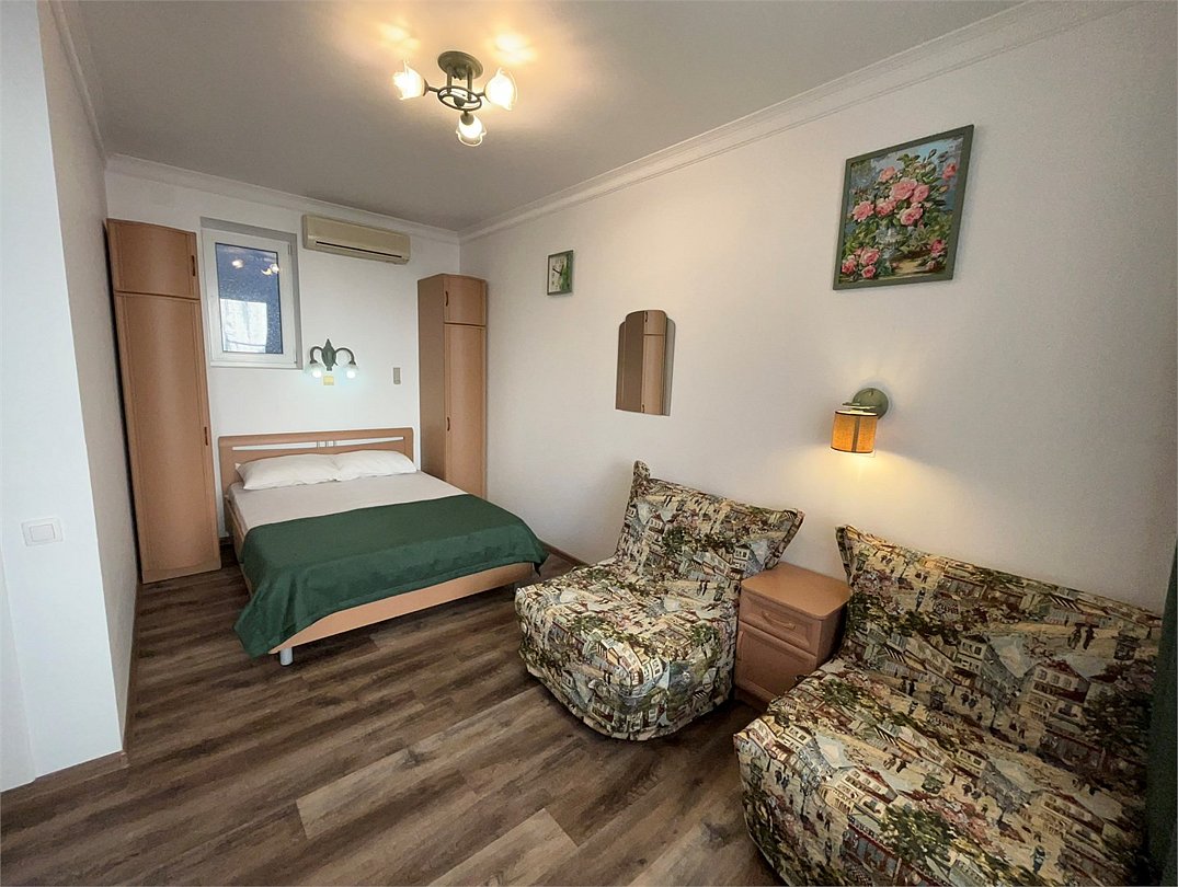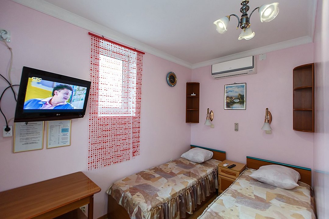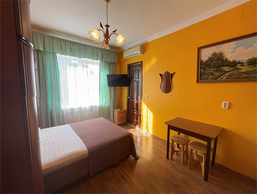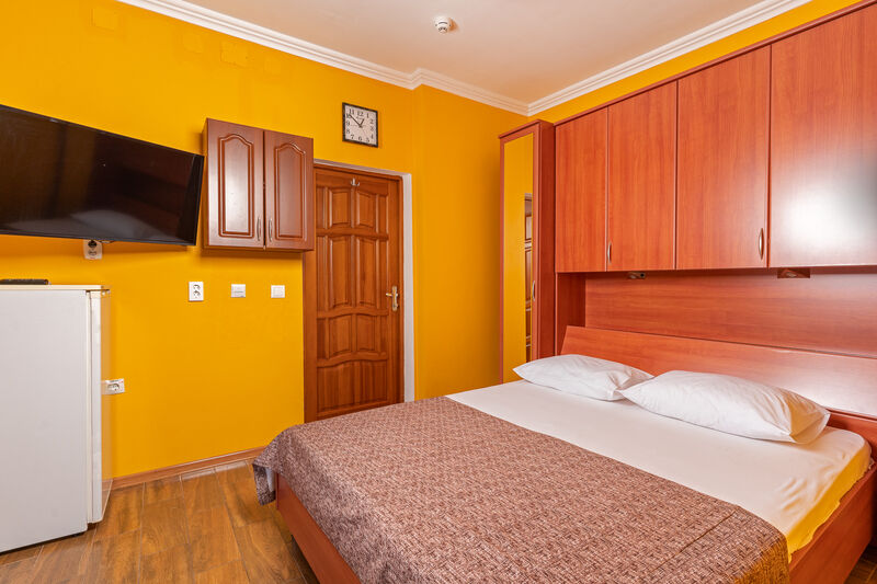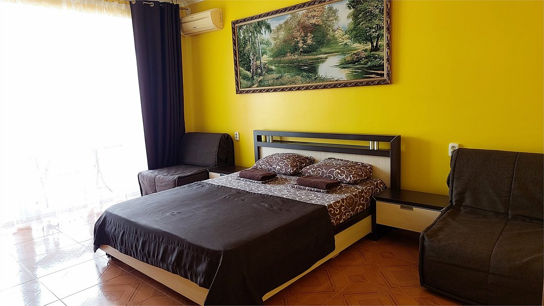 Двухместная комната, оформленная в современном стиле. Комфортабельные комнаты категории «Стандарт», рассчитанные на размещение от 1 до 4 человек, цена указана за номер. Обеспечены всем необходимым для полноценного отдыха. Комнаты оснащены: двуспальной кроватью, LCD телевизором, сплит системой, сейфом для удобства хранения ценных вещей, холодильником, отдельным санузлом, посудой и wi-fi. Дополнительные места, комфортабельные кресло - кровать. На каждом этаже есть гладильная доска с утюгом. Для категории Стандарт улучшенный предусмотрены террассы, на которых имеется кухня для самостоятельного приготовления пищи, а так же столы и стулья для того чтоб посидеть на свежем воздухе и насладиться приятным климатом гостеприимного курорта.Услуги и удобства