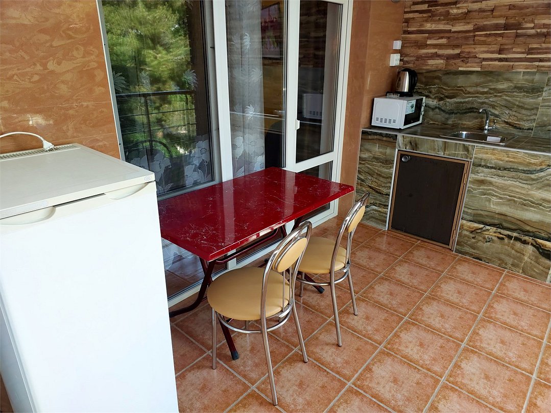 Стандарт с террасой. Оформленные в современном стиле, комфортабельные комнаты категории «Стандарт», рассчитанные на размещение 2 человек и 1 человек (доп место). Обеспечены всем необходимым для полноценного отдыха. Расстояние до моря 600 метров. Санузел в номере.Услуги и удобства