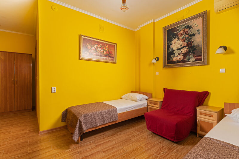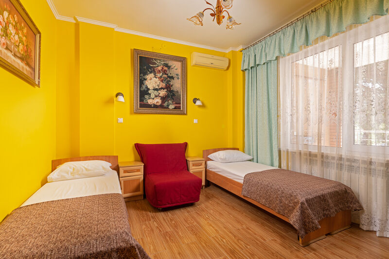Wi-Fi, холодильник, терраса, две односпальные кровати, стулья, шкаф для одежды, вешалки, обеденный стол, зеркало, набор посуды, сейф, чайник, обеденная зона, отопление, душ, вид во двор, кухонная посуда, туалет, сплит-система, цифровое тв, кресло-кровать, услуги прачечной (платно), прачечная (за дополнительную плату)В номере