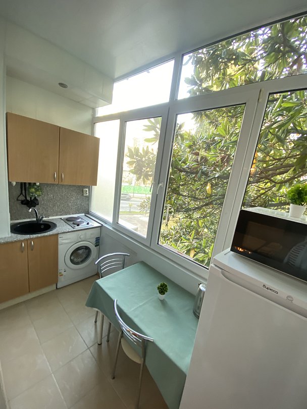 Апартаменты с видом на магнолии в мятных тонах. Вместимость до 3 гостей. Вариации кроватей: Двуспальная кровать (160см/200см) и кресло-кровать (188см/80см). Комплектация: санузел, кровать, кресло-кровать, тумбы, шкаф, столы, стулья, кухонный гарнитур, микроволновая печь, стиральная машина, электрочайник, электрическая плита, посуда, холодильник, телевизор, фен, утюг, WI-FI роутер, светильники, постельное белье, полотенца, туалетные принадлежности.