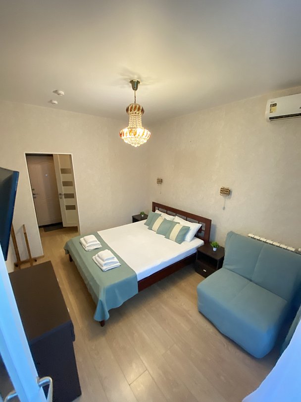 Стандартные апартаменты с 1 спальней в светло-зеленых тонах. Вместимость до 3 гостей. Вариации кроватей: Двуспальная кровать (160см/200см) и кресло-кровать (188см/80см), расположенное в зоне застекленной лоджии или две раздельные (80см/200см*2) и кресло-кровать (188см/80см), расположенное в зоне застекленной лоджии.. Комплектация: кровати, кресло-кровать, тумбы, комод, журнальный столик, шкаф, стол, комфортные стулья, кухонный гарнитур, микроволновая печь, стиральная машина, электрочайник, электрическая варочная встроенная плита, посуда, холодильник, телевизор, фен, утюг, WI-FI роутер, постельное белье, полотенца, туалетные принадлежности.