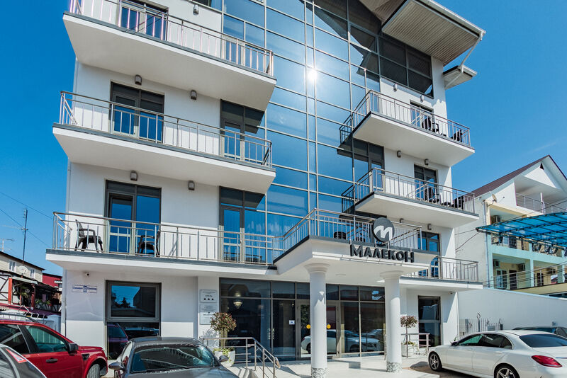 Белоснежное здание отеля с высокими панорамными окнами, с современными, прекрасно меблированными номерами и лифтом, возвышается над окрестностями и из него открывается изумительная панорама природы субтропической зоны: безбрежные морские просторы, величественные отроги Кавказских гор, зелень южного побережья.
