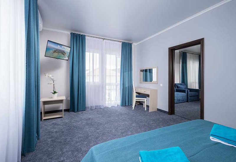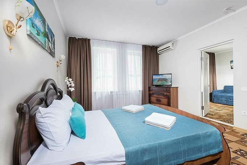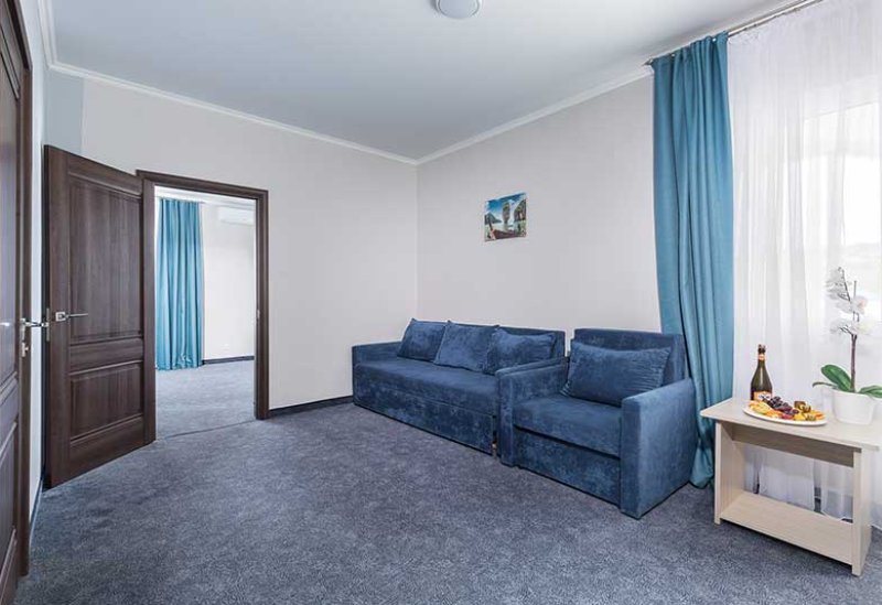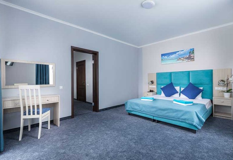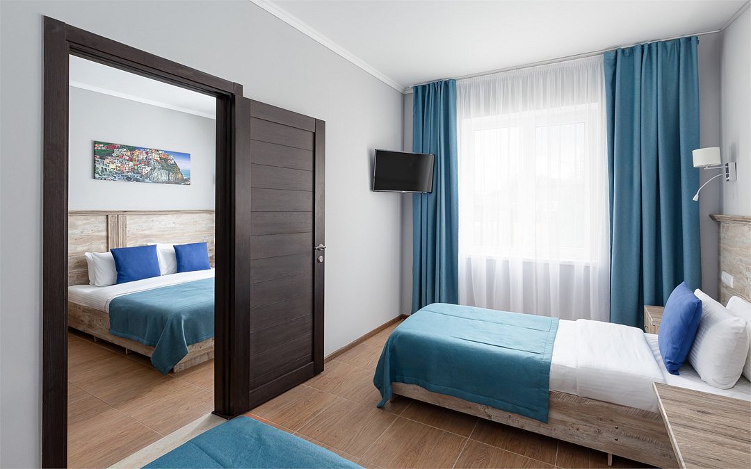 Номер с межкомнатной дверью. В одной комнате двуспальная кровать и раскладное кресло, во второй комнате двуспальная кровать/две односпальные кровати и кресло-кровать или еврораскладушка. Номер располагается на 1 этаже в корп.4.Услуги и удобства
