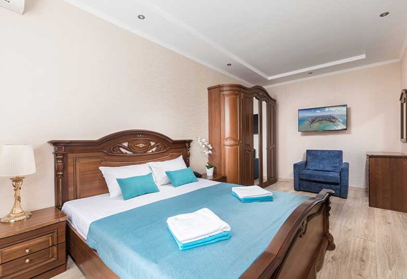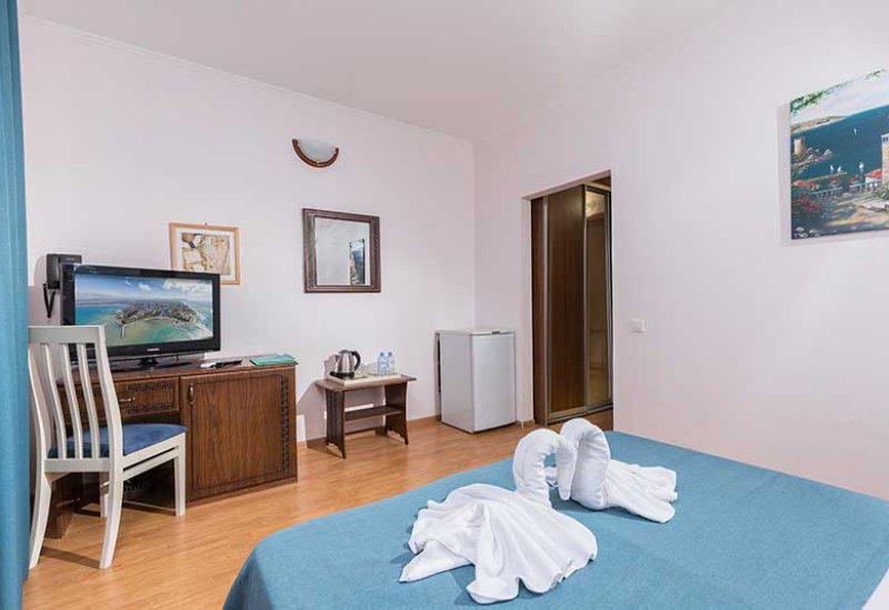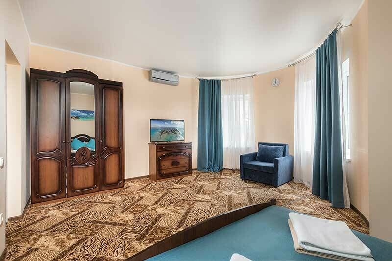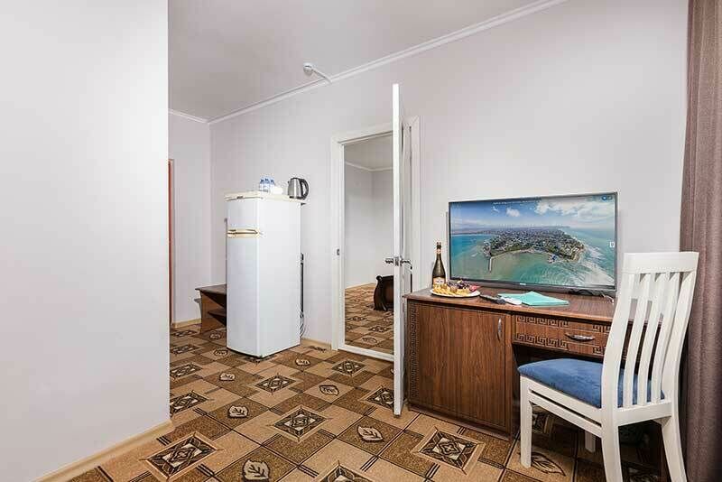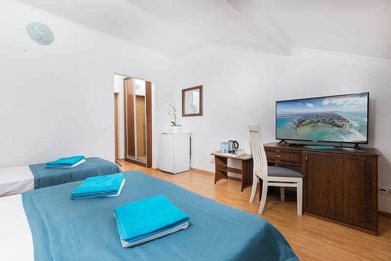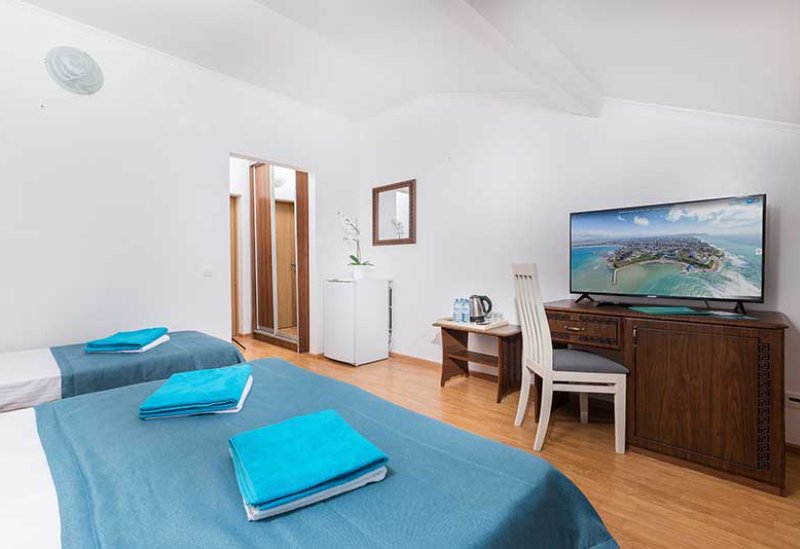 кабельное телевидение, Wi-Fi, телефон, настольные лампы, фен, утюг, ванная комната, санузел, халаты, банные полотенца, тапочки, косметические средства, двуспальная кровать, односпальная кровать, гладильная доска, тумбы, шкаф для одежды, вешалки, журнальный столик, багажная тумба, пуфики, чайный набор, сейф, чайник, раковина, питьевая вода, вид во двор, стаканы, стул, туалетный столик, сплит-система, сушилка для белья, телевизор с плоским экраном, мини-холодильник, номер для некурящих, общественный бассейнВ номере