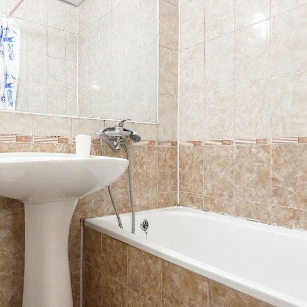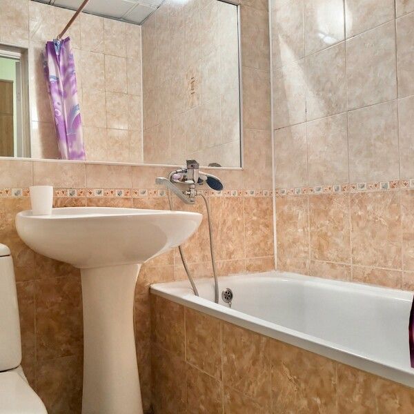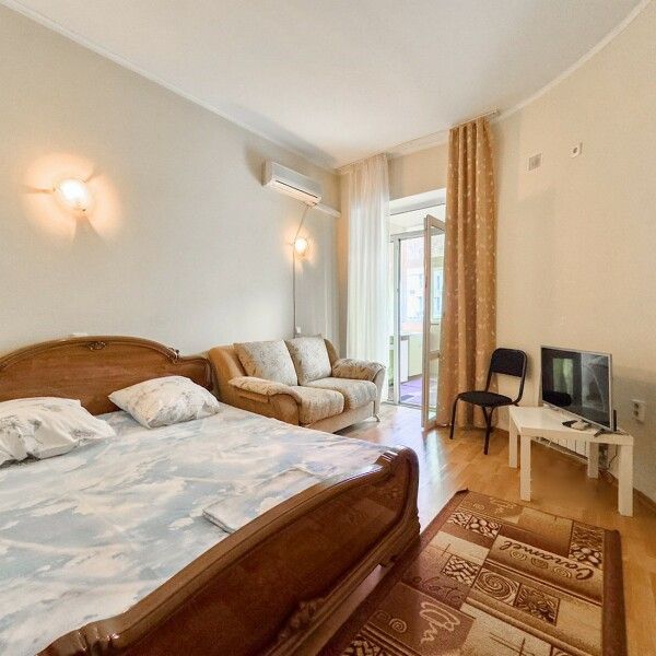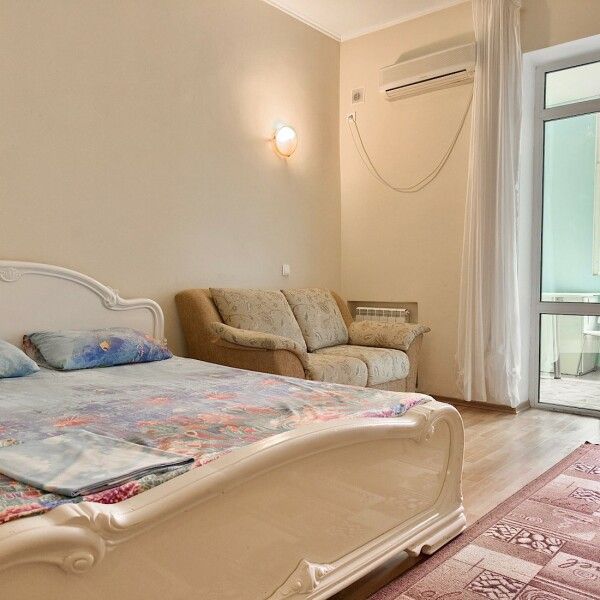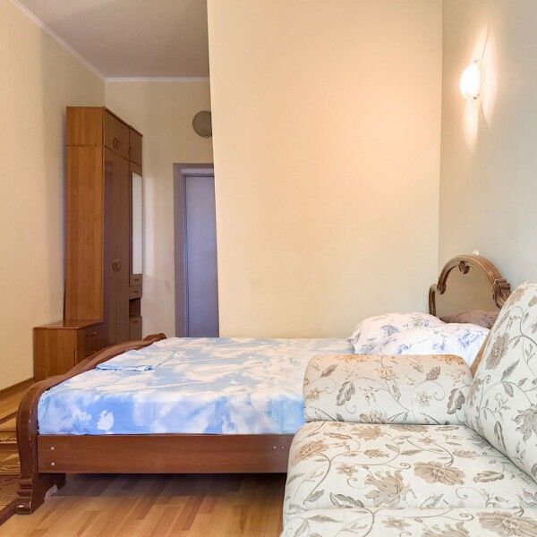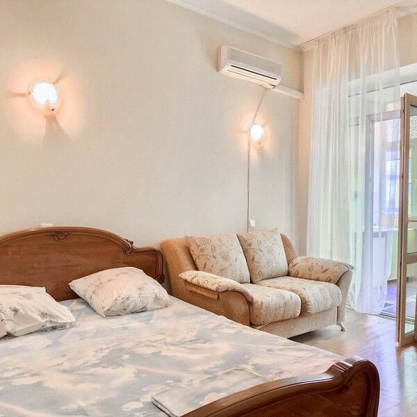 В номере: 2 двуспальные кровати, 2 односпальных дивана. Имеется: Балкон, телевизор, кондиционер, шкаф, вешалка, зеркало, журнальный столик, кухня, газовая плита, посуда, столовые приборы, холодильник, чайник, стулья, корзина для мусора. Индивидуальная ванная комната: ванна, раковина, туалет.
