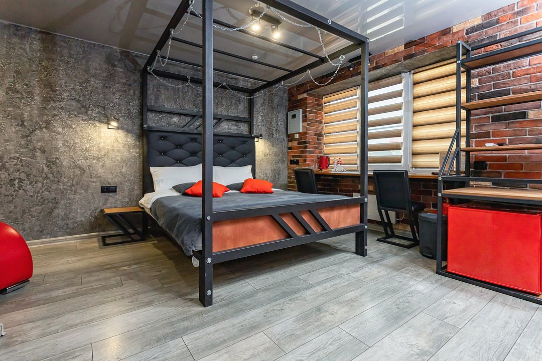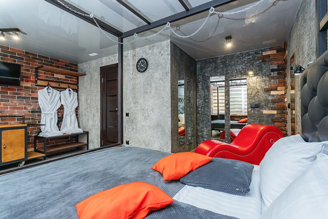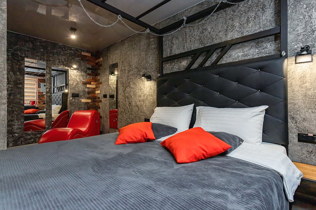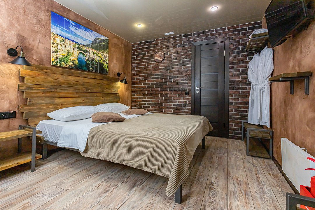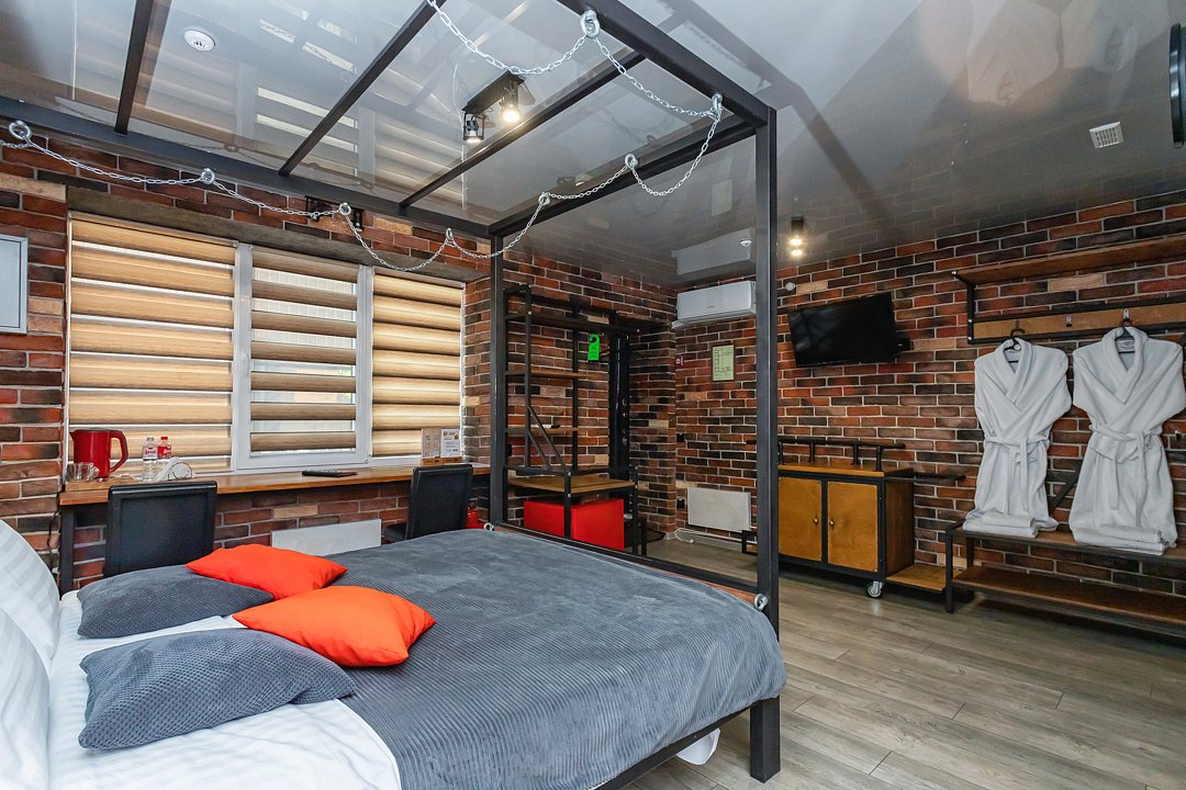 Брутальный номер лофт в стиле современных людей. В отделке мебели использована только ручная работа с авторским дизайном из железа и дерева.