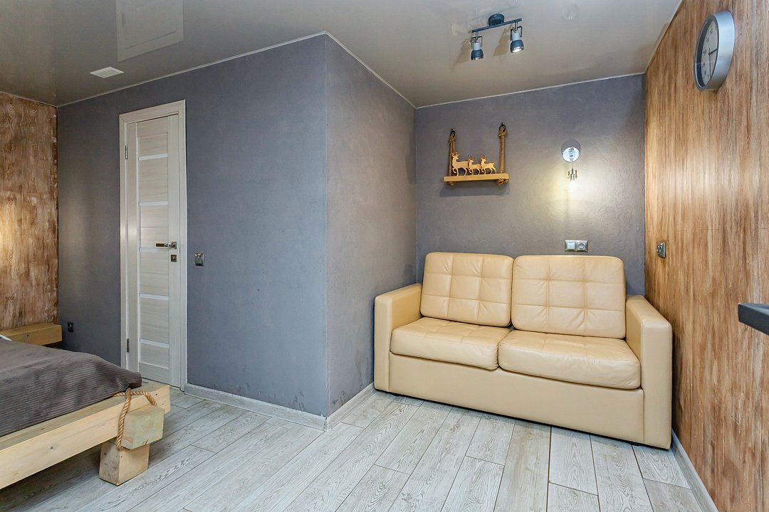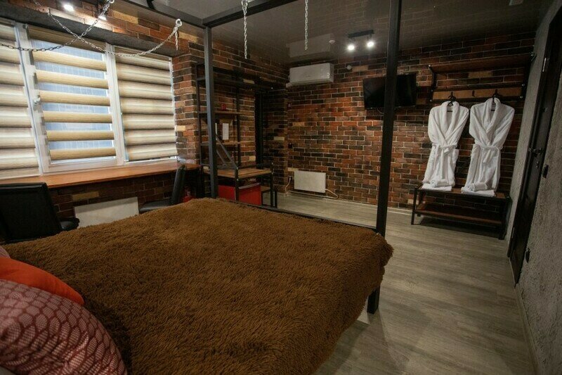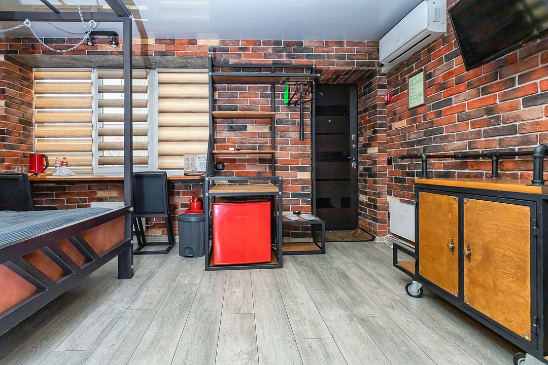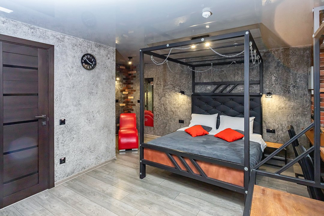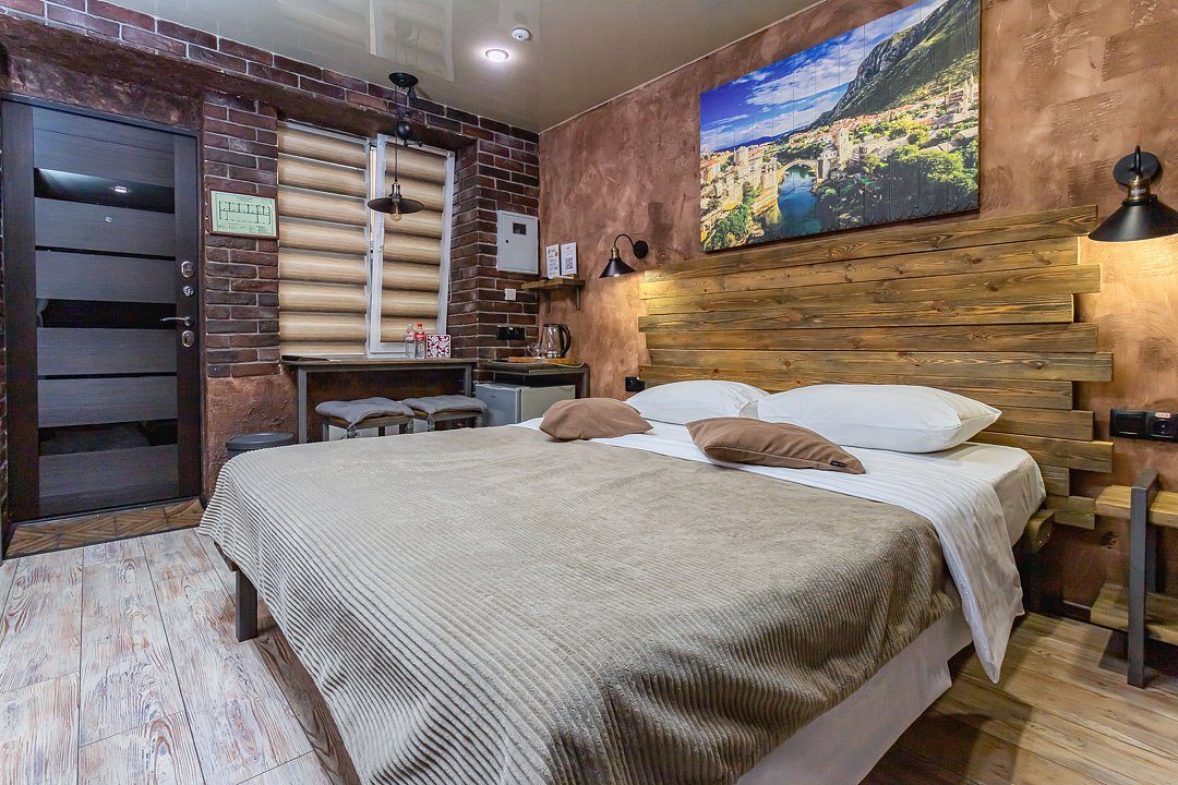 Брутальный номер лофт в стиле современных людей. В отделке мебели использована только ручная работа с авторским дизайном из железа и дерева.