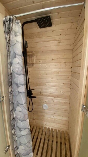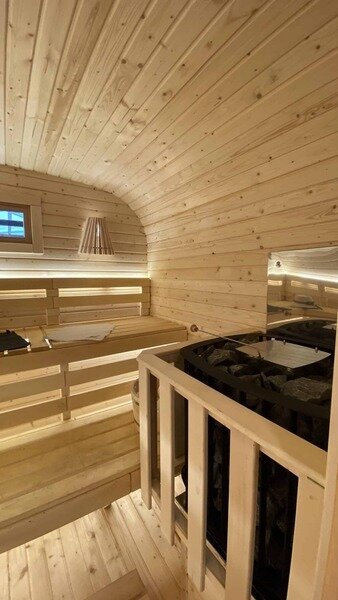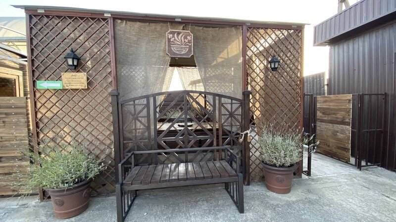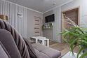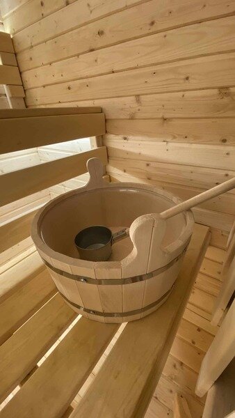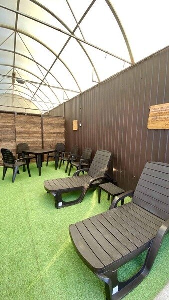 При бане есть закрытый лаунж, столик с креслами и шезлонгами, СПА бассейн джакузи(за доп. плату) и подогревом до 40 градусов и с двумя видами массажа: гидро и аэро, душ, шапки для бани, теннисный стол, помещение, где можно выпить чай после бани и посмотреть фильм или ТВ-передачи.