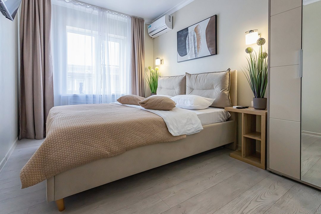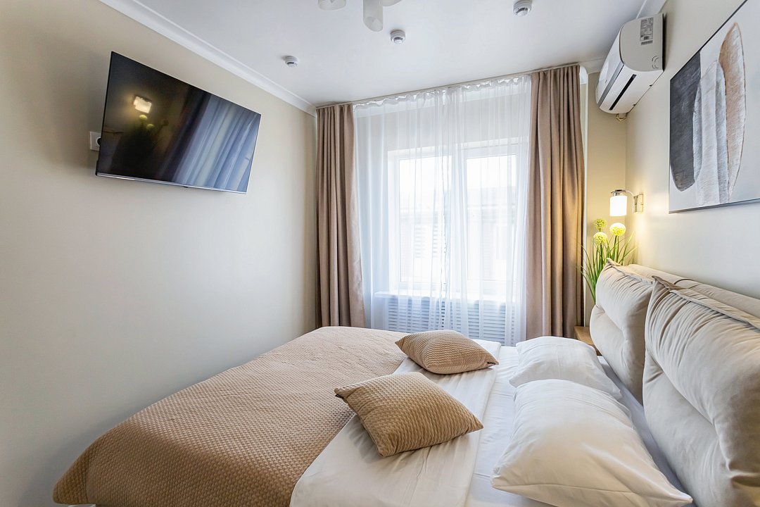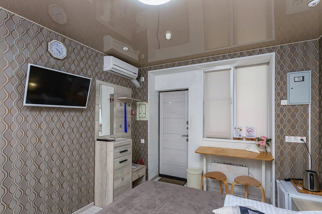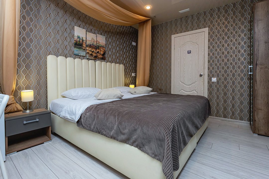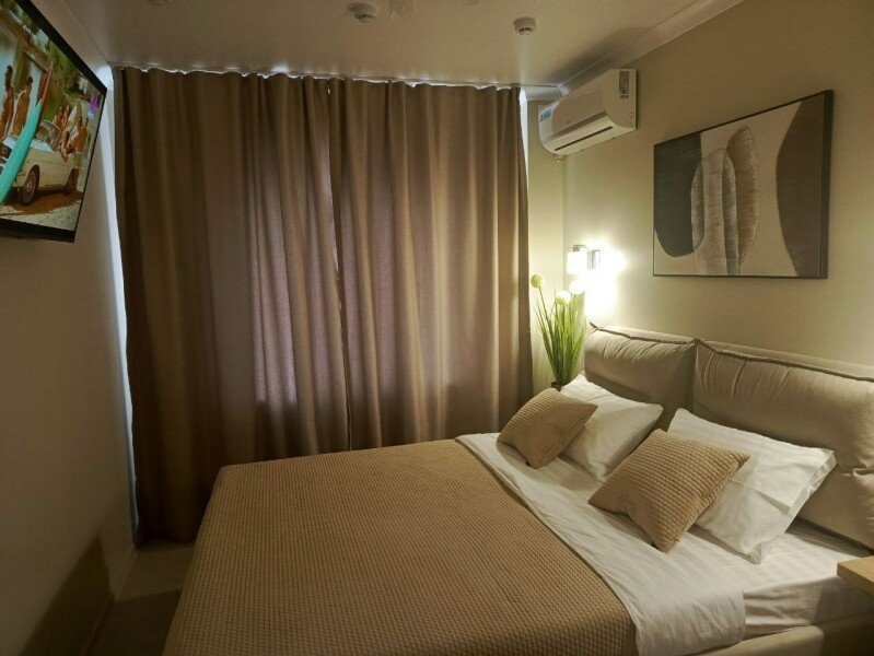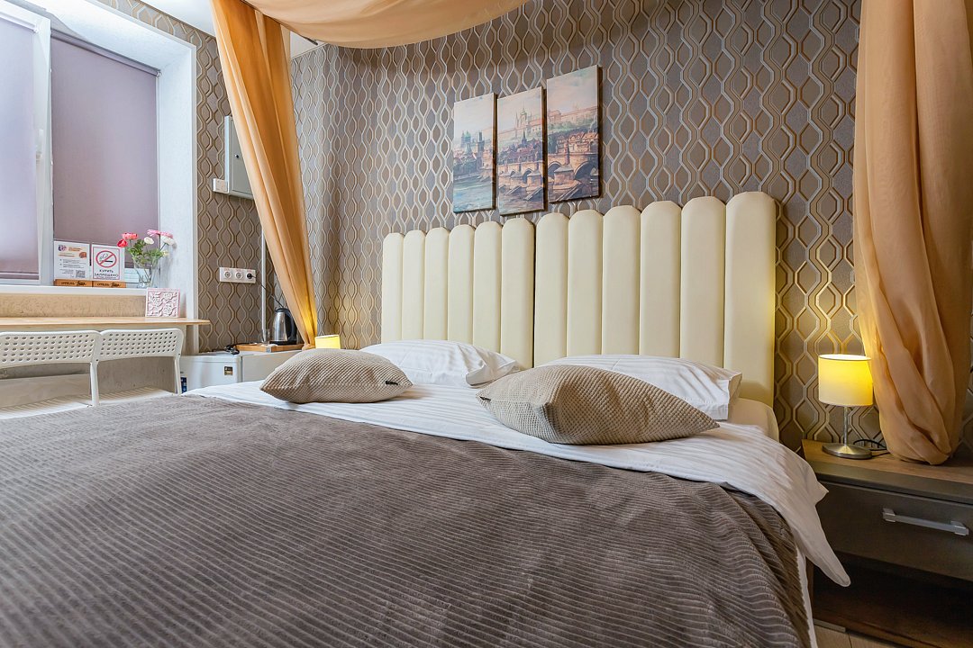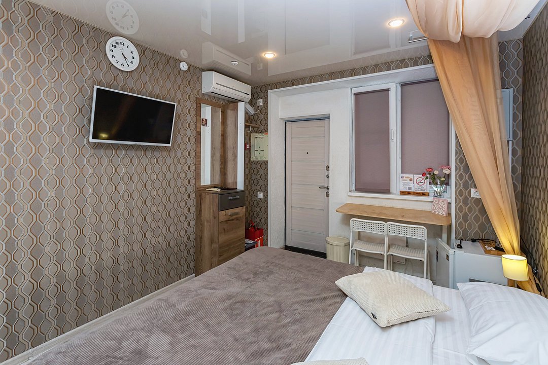 Практичный комфортный номер с максимальным наполнением! Отличительной особенностью комнаты на 2-х человек в гостевом доме Питер является прежде всего повышенная степень комфортности и особый, романтический стиль в интерьере, который задает легкий, полупрозрачный балдахин. Интерьер комнаты выдержан в теплых, песочных тонах.