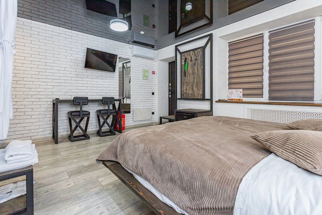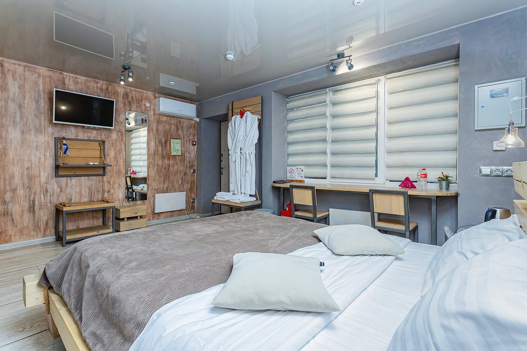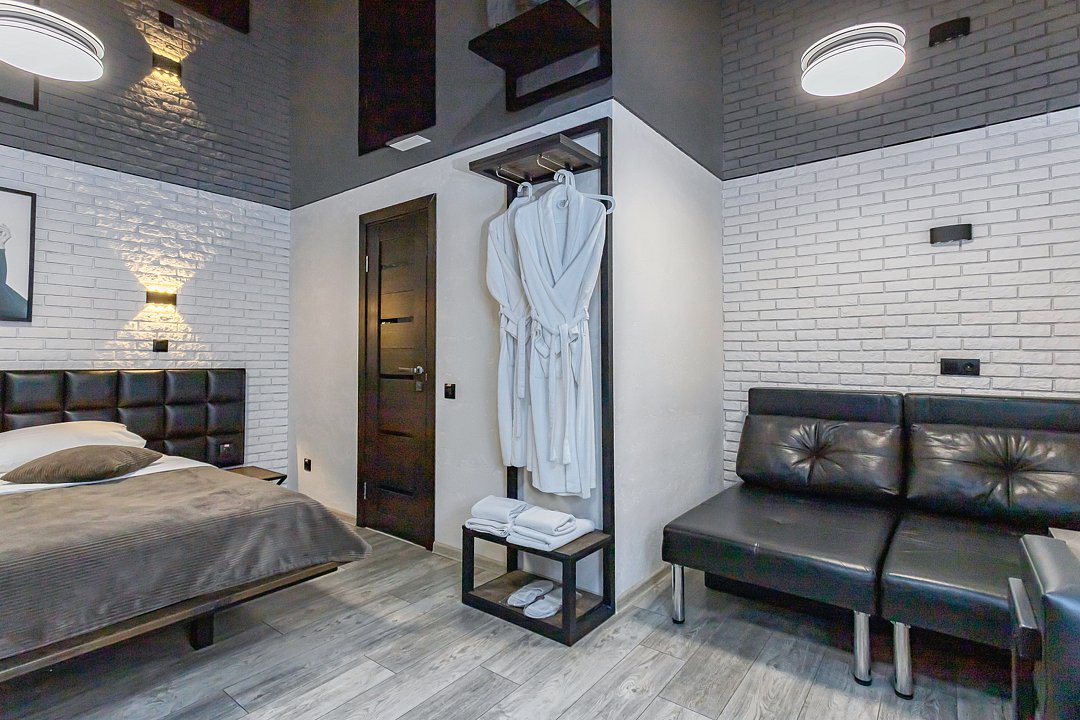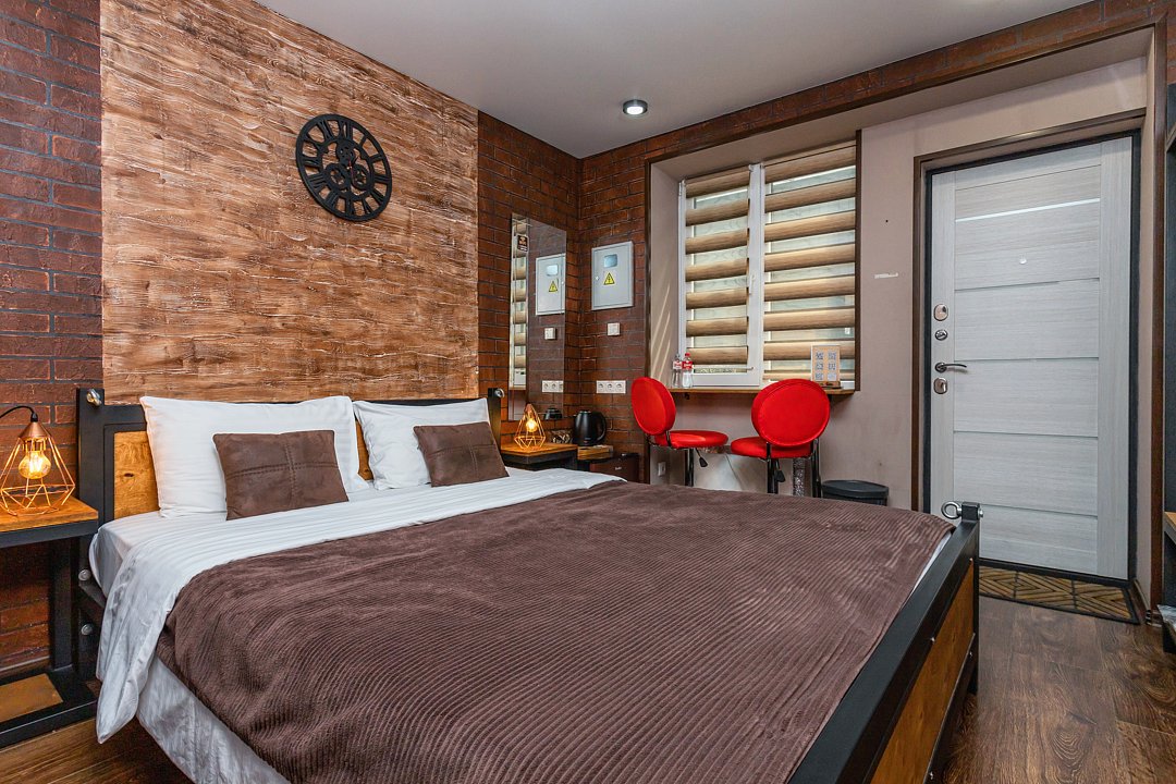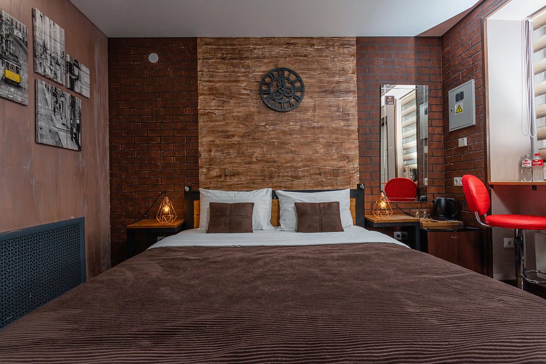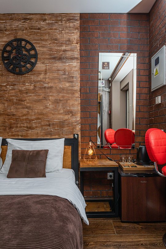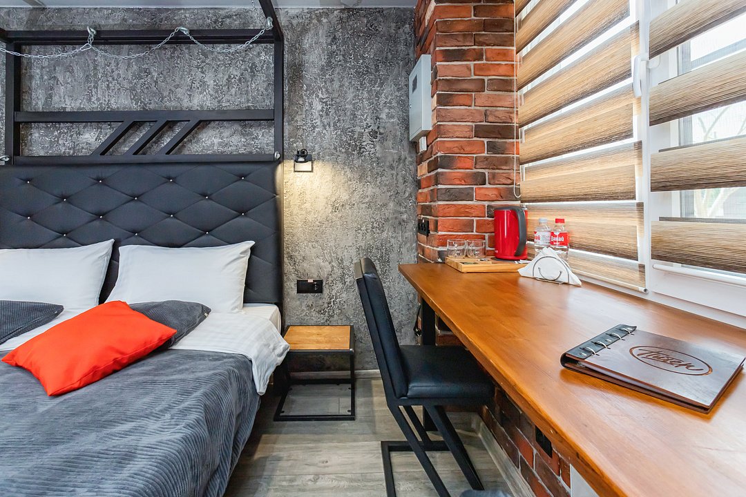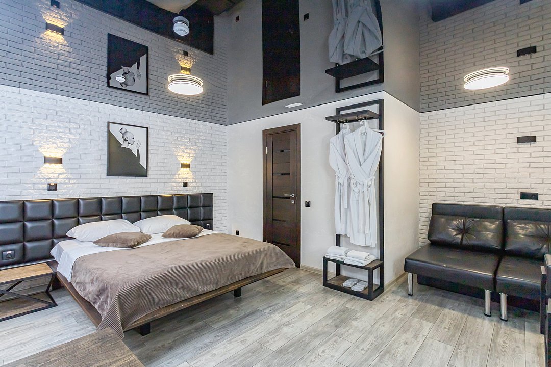 Практичный комфортный номер с максимальным наполнением! Отличительной особенностью является дизайн номера, повышенная степень комфортности и особый, брутальный стиль в интерьере.