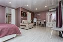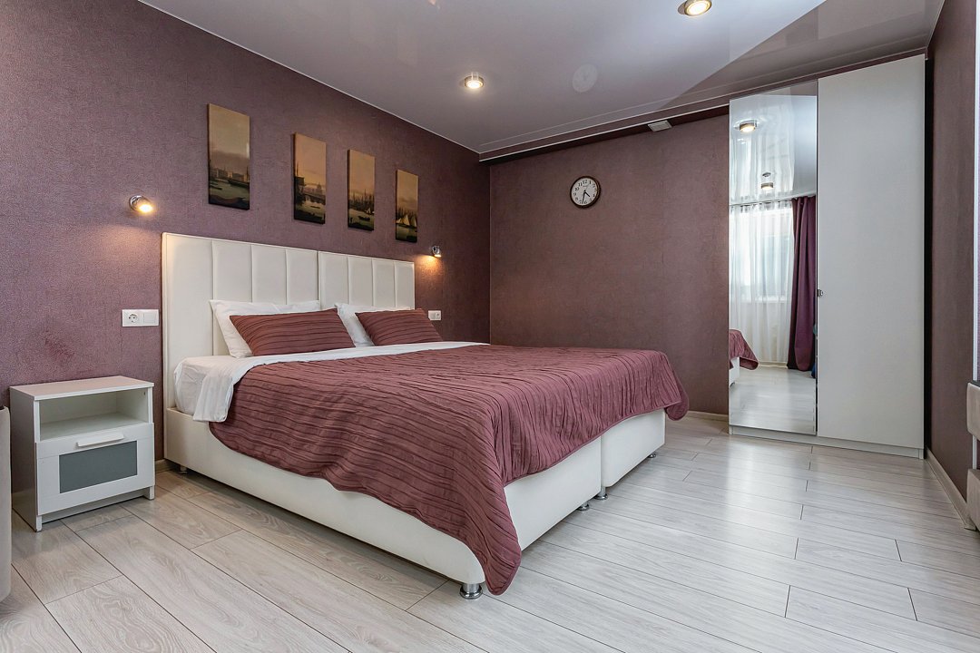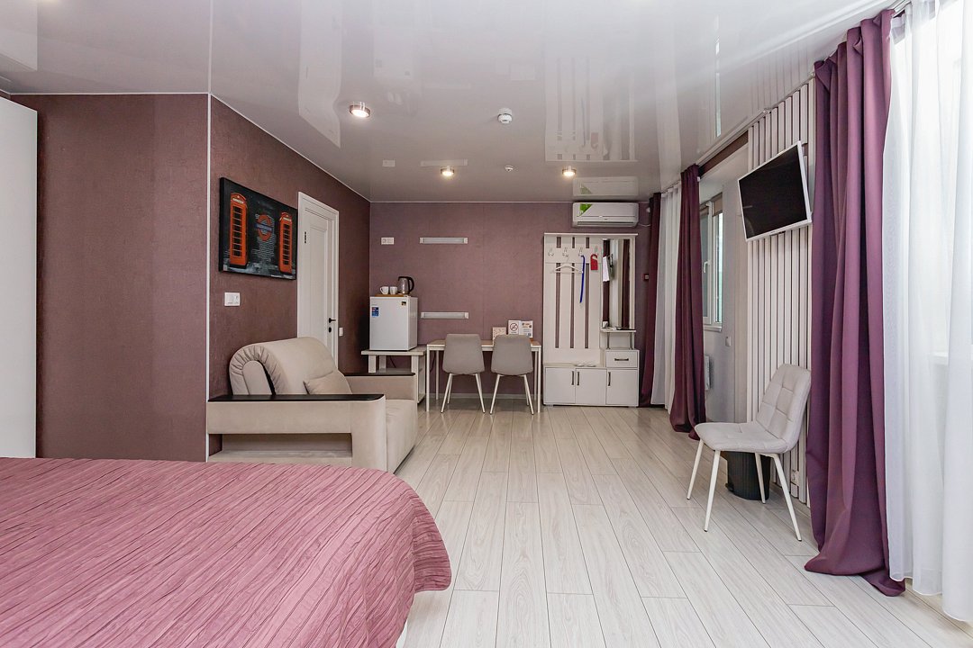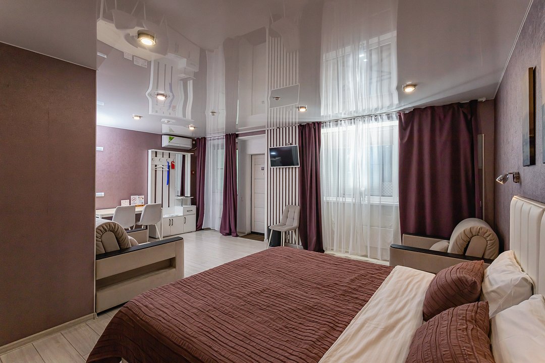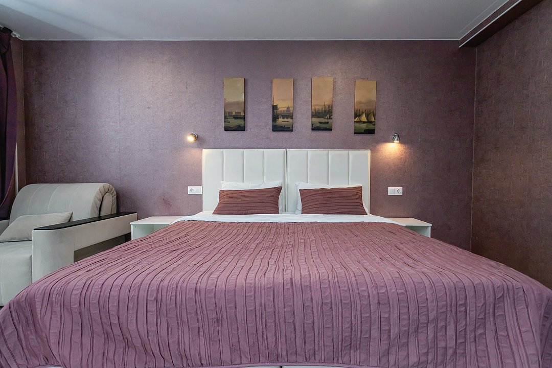 Комната Полулюкс на 4х человек, оформленная в приглушенных, бордовых тонах, отлично подойдет как для семейных пар, так и для туристов, находящихся в деловой, командировочной поездке.