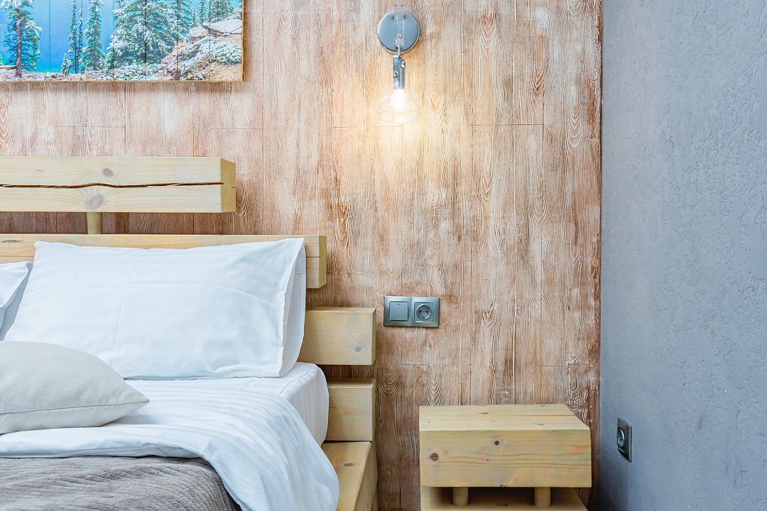 Современный номер лофт в стиле северной Финляндии. В отделке мебели использована только ручная работа с авторским дизайном из железа и дерева.