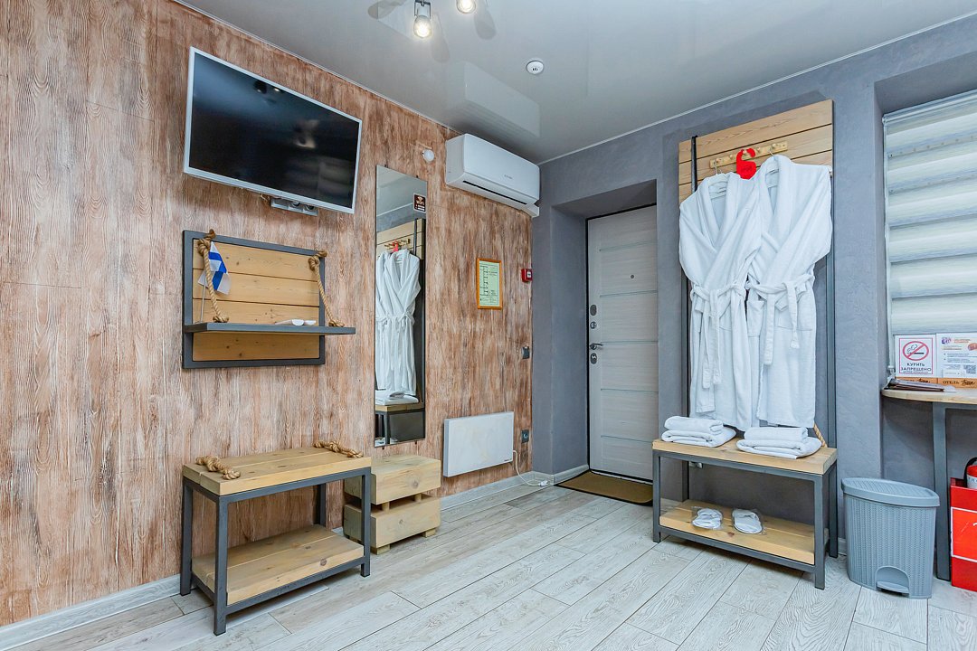 При бане есть закрытый лаунж, столик с креслами и шезлонгами, СПА бассейн джакузи(за доп.плату) и подогревом до 40 градусов и с двумя видами массажа:гидро и аэро, душ, шапки для бани, теннисный стол, помещение, где можно выпить чай после бани и посмотреть фильм или ТВ-передачи.