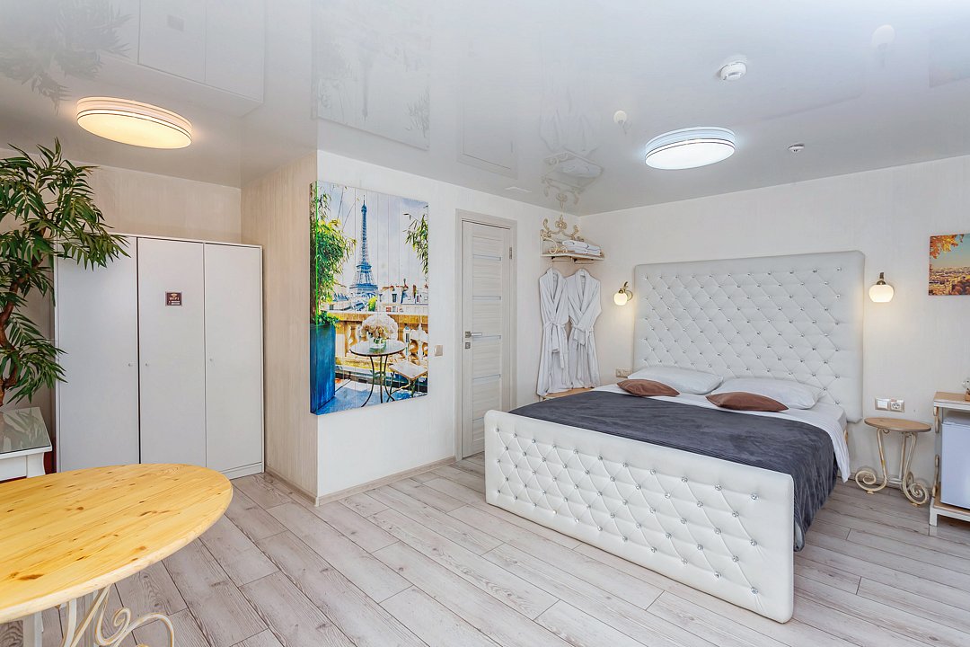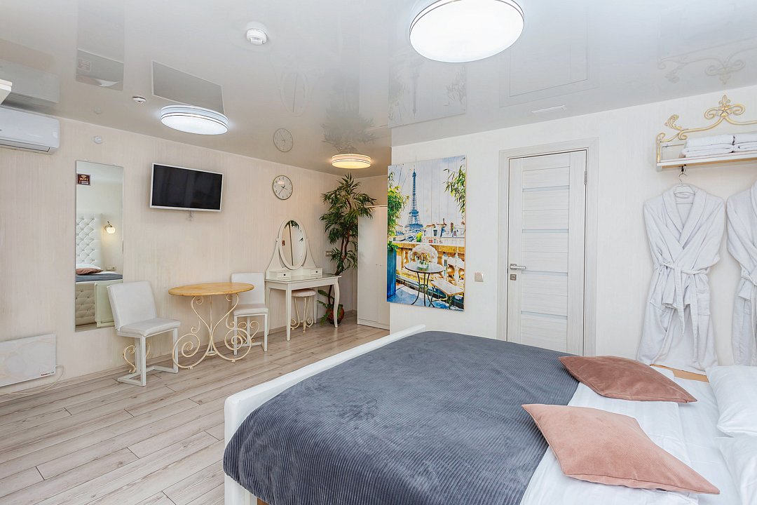Изысканный номер лофт во французском, романтическом стиле. Во всей отделке мебели использована только ручная работа с авторским дизайном из декорированного ажурного металла и кожи.