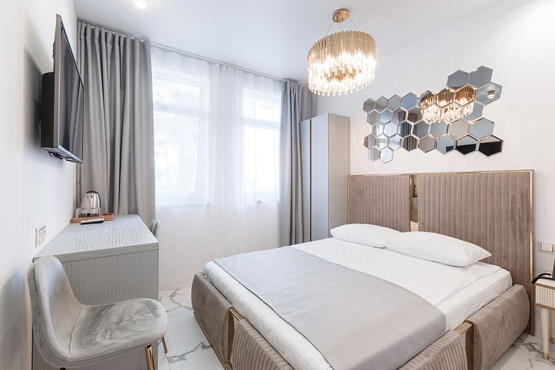Классический стандартный номер на двоих (ремонт 2022 год). В номере — 1 двуспальная кровать, кондиционер, телевизор, чайник, стол со стульями, шкаф, мини-холодильник, сейф и мини-бар. В номере также есть собственная ванная комната с душевой кабиной, базовыми косметическими средствами, полотенцами, халатами и тапочками.