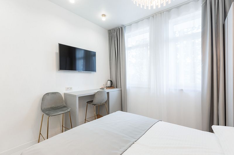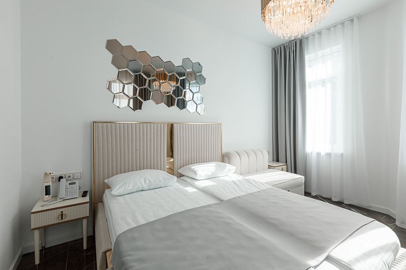 Комфортный номер (ремонт 2022 года) на двоих с 2 односпальными кроватями. В комнате — кондиционер, телевизор, чайник, мини-холодильник, шкаф, сейф, стол со стульями и мини-бар. Номер оборудован собственной ванной комнатой с душем и базовыми гигиеническо-косметическими средствами. Для гостей приготовлены полотенца, халаты и тапочки.