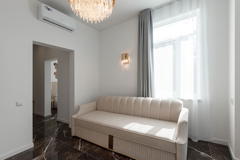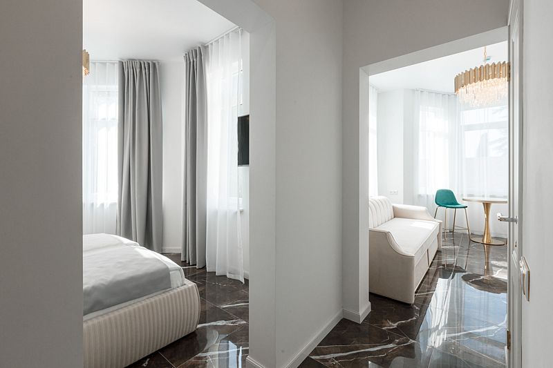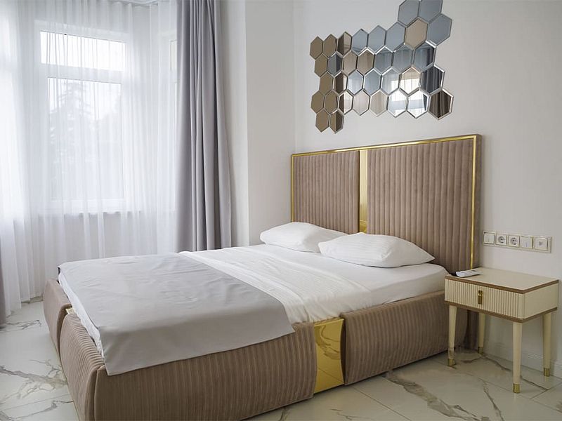 Двухкомнатные апартаменты на двоих (+2 дополнительных места) с ремонтом 2022 года. Один из номеров категории оборудован кухней с плитой, раковиной и микроволновой печью. В комнате — 1 двуспальная кровать, раскладной диван и кресло. Также есть кондиционер, кухонная зона, стол со стульями, шкаф, холодильник, мини-бар, телевизор, чайник, сейф. В наличии собственная ванная комната. Для гостей приготовлены косметические средства, халаты и тапочки, полотенца.