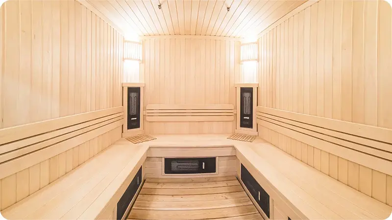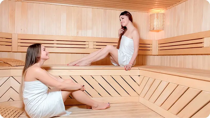 Сауна обладает температурой до 100°C и влажностью 15–30%, что делает ее комфортной для посещения, поскольку влага быстро испаряется с кожи. Для предотвращения пересушивания дыхательных путей и слизистой не рекомендуется находиться в сауне более 15 минут.