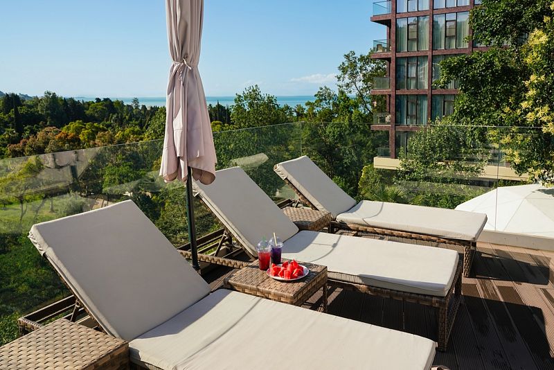 Просторный однокомнатный номер с одной двуспальной кроватью, раскладным креслом и балконом или лаунж зоной с видом на море и парк Дендрарий.