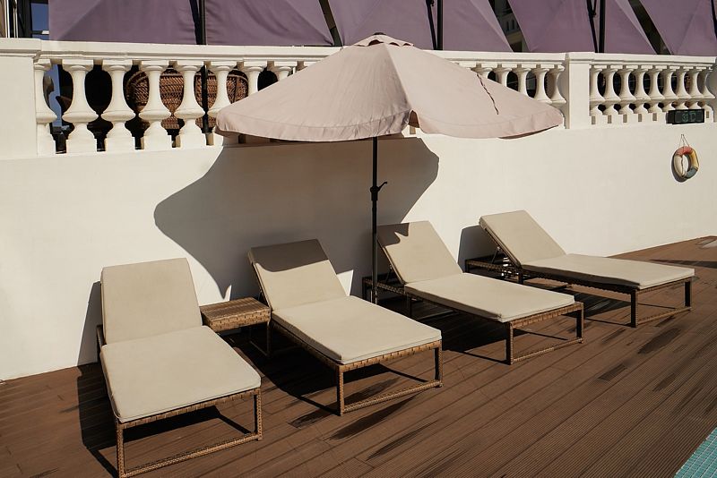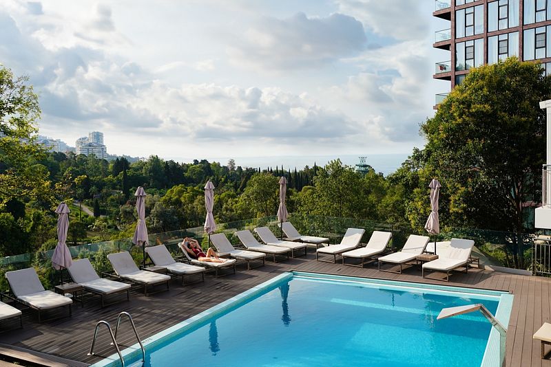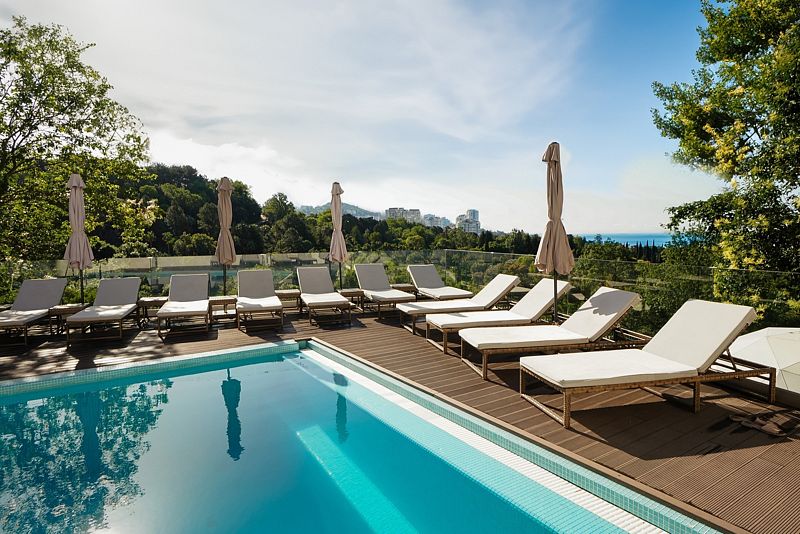 Сотрудники отеля тщательно следят за чистотой воды, обеспечивая комфорт и безопасность гостей. Для вашего удобства предусмотрены лежаки и зонты, где можно расслабиться и насладиться коктейлями, любуясь прекрасными видами на дендрарий и Черное море.