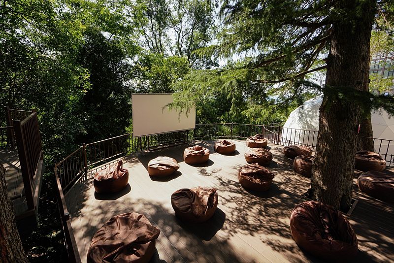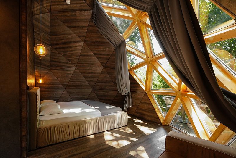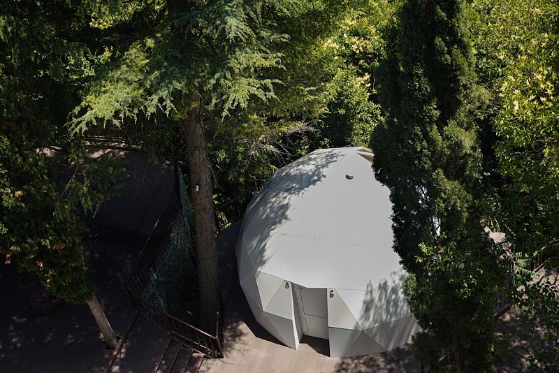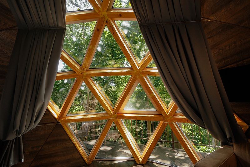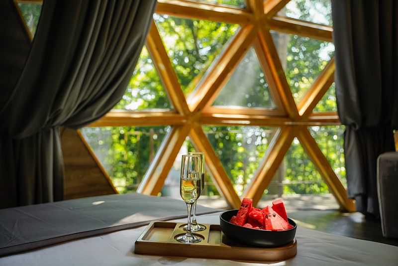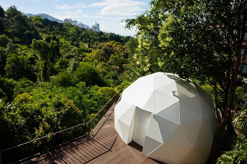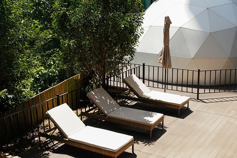 Купольный домик под открытым небом с панорамным остеклением с двуспальной кроватью, раскладным креслом и террасой с лежаками с видом на парк Дендрарий.