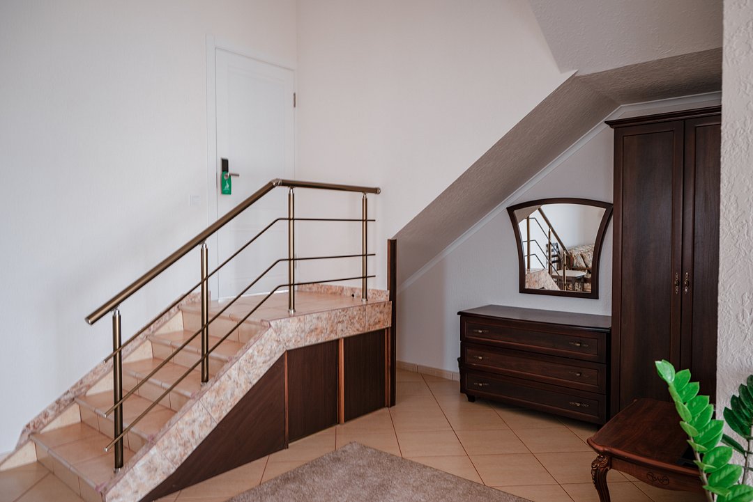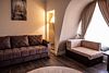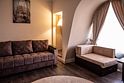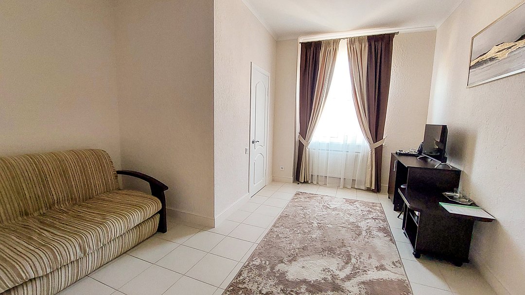 Номер оснащен всем необходимым для комфортного отдыха. В первой комнате - выход на балкон, двуспальная кровать, туалетный столик. Во второй комнате раскладной диван, шкаф, телевизор, ванная комната с душем и сан. узлом.