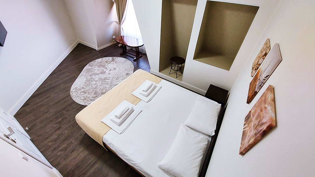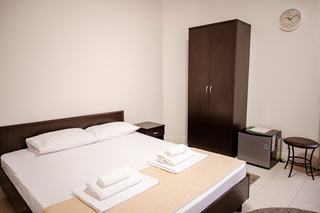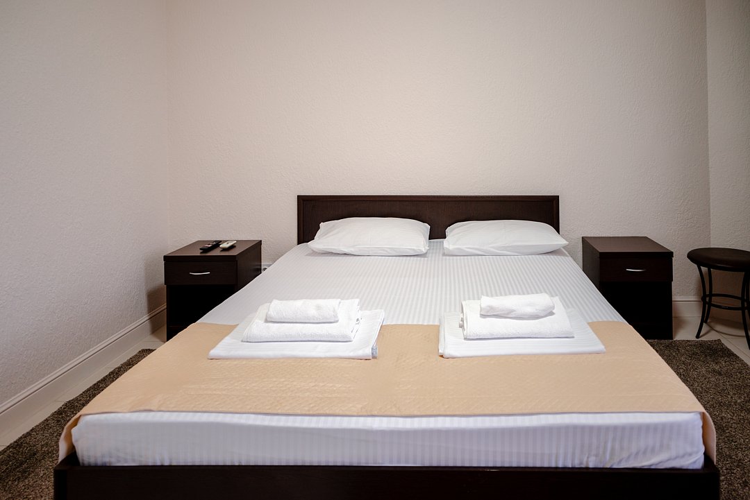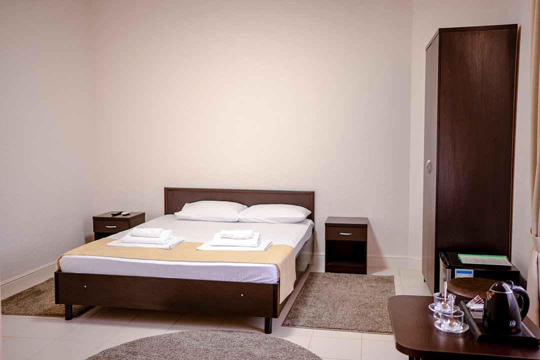 В номере одна двуспальная кровать шкаф, телевизор, холодильник, сплит система, фен, душевая комната с сан. узлом.