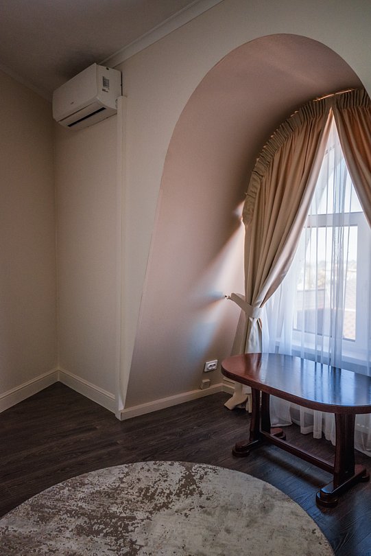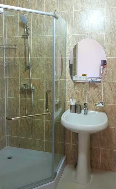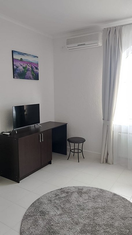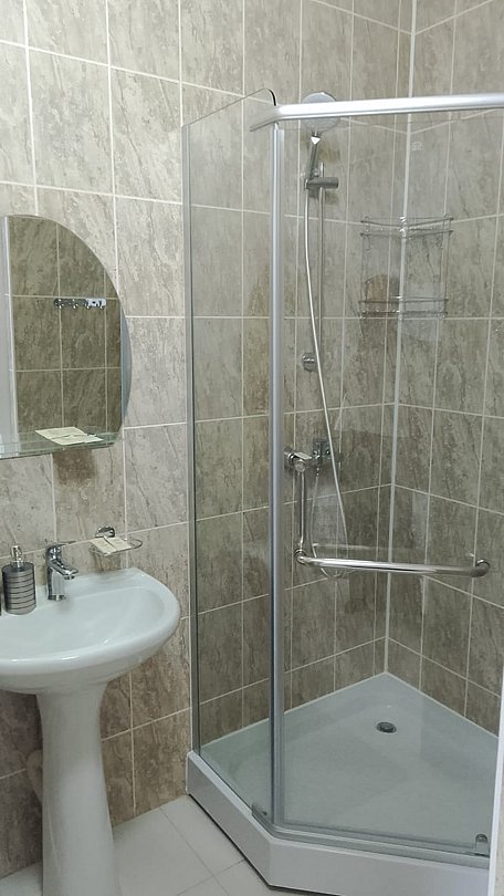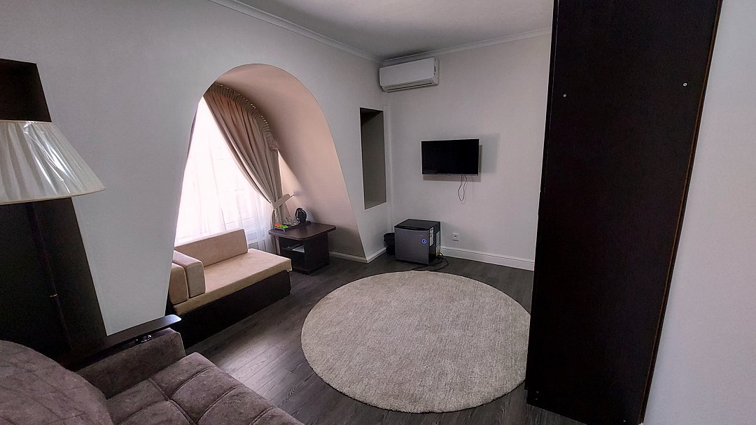 В номере одна двуспальная кровать. раскладной диван. шкаф, телевизор, холодильник, сплит система, просторная ванная комната с душем и сан. узлом, фен.