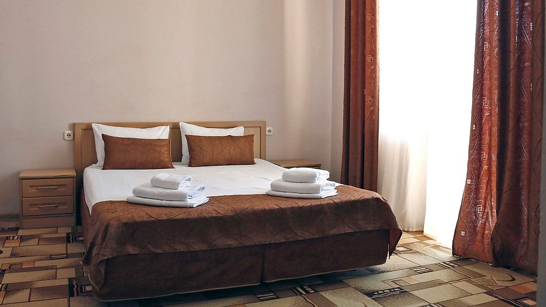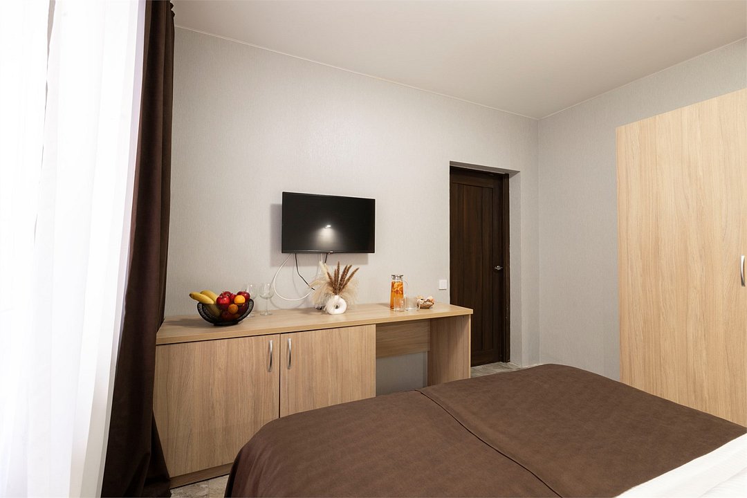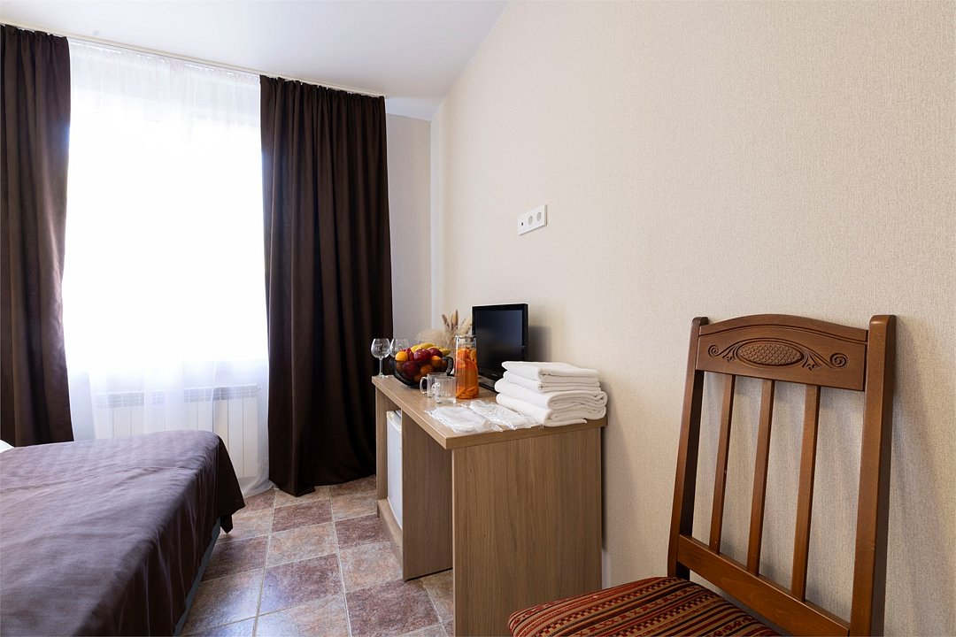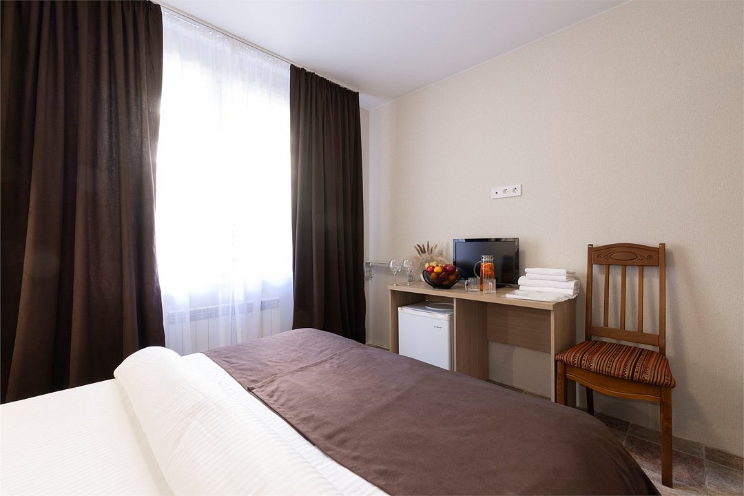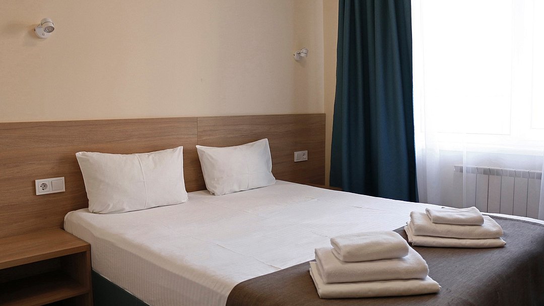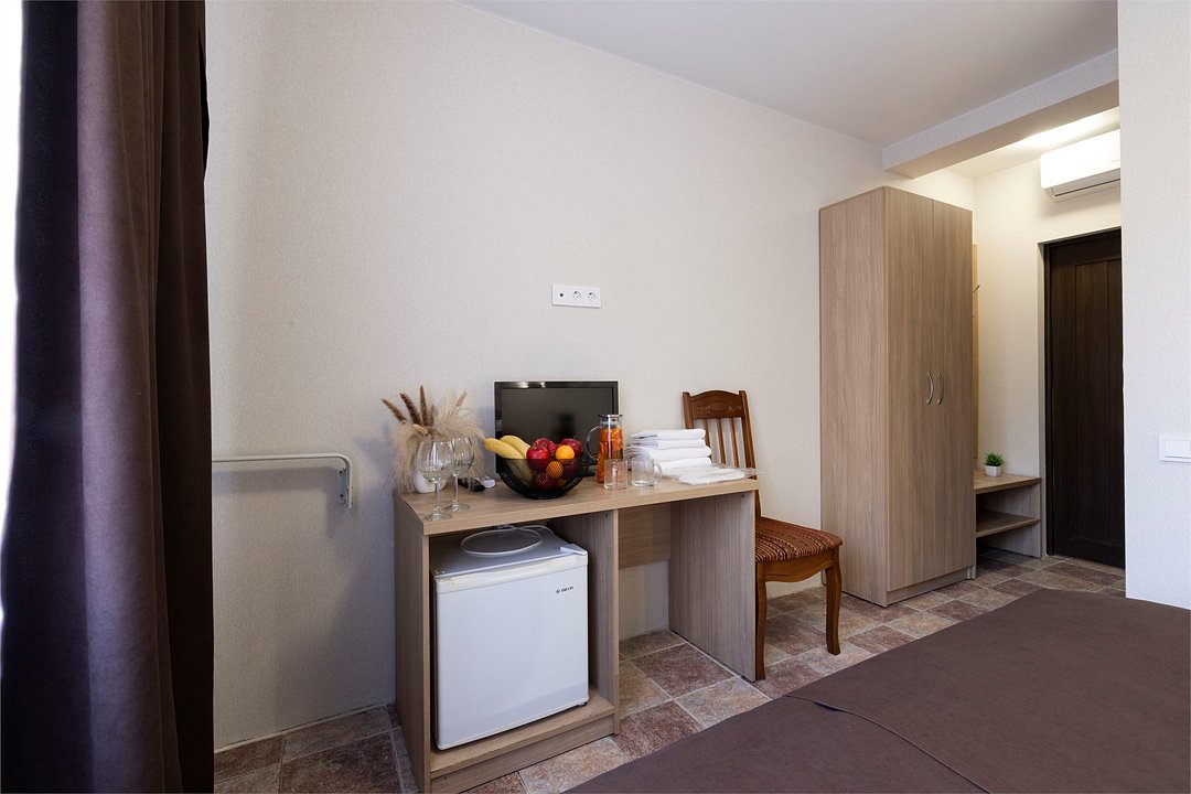 Двухместный номер «Стандарт» без балкона Комфортный и просторный вариант для отличного отдыха. Площадь номера: 15 кв.м Располагается на 1 этаже. Максимальное количество гостей: 2 взрослых + ребёнок до 3-х лет бесплатно на одной кровати с родителями. Оснащение номера: - кровать размера king-size - две прикроватные тумбочки, шкаф для одежды, комод, зеркало, журнальный столик - телевизор, холодильник, кондиционер, фен - вид во двор - полностью оборудованная ванная комната: душ, туалет, тапочки, набор полотенец, халат, туалетно - косметические принадлежности (мыло, шампунь, гель для душа, туалетная бумага).Услуги и удобства