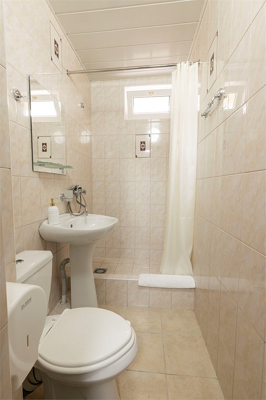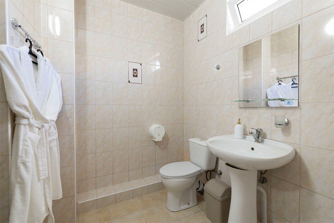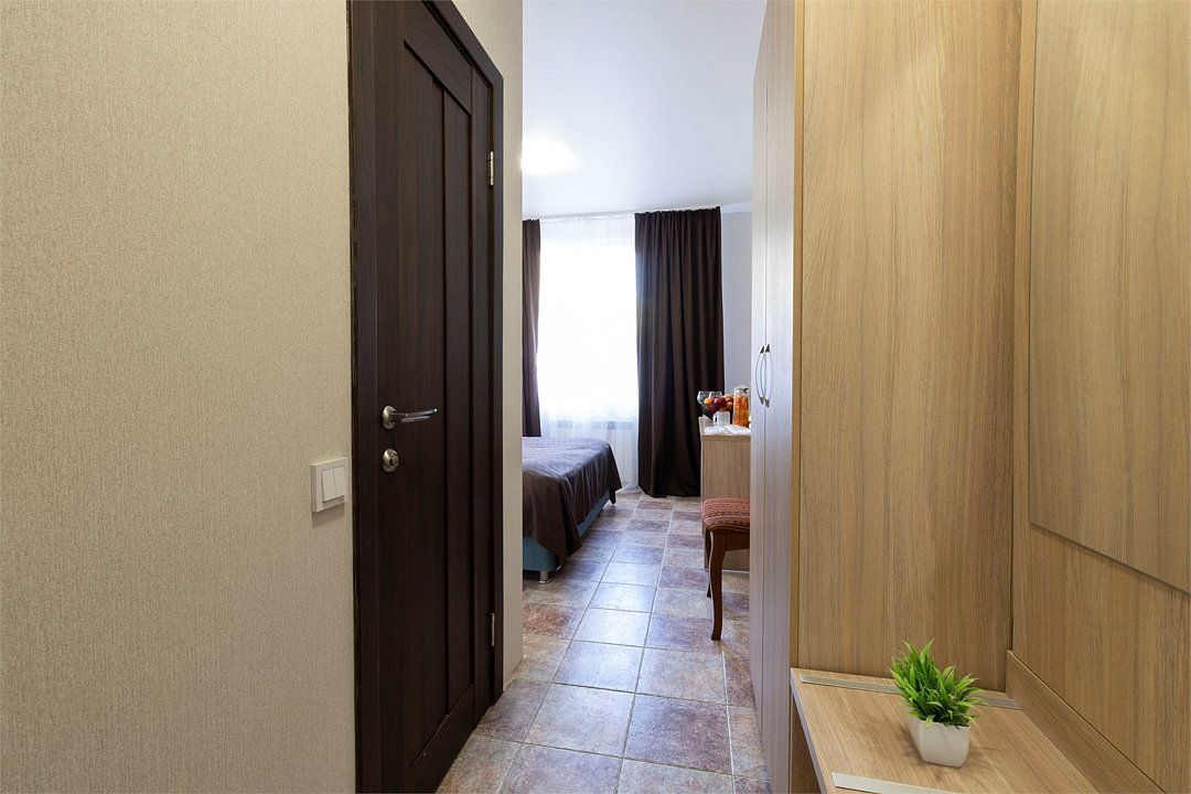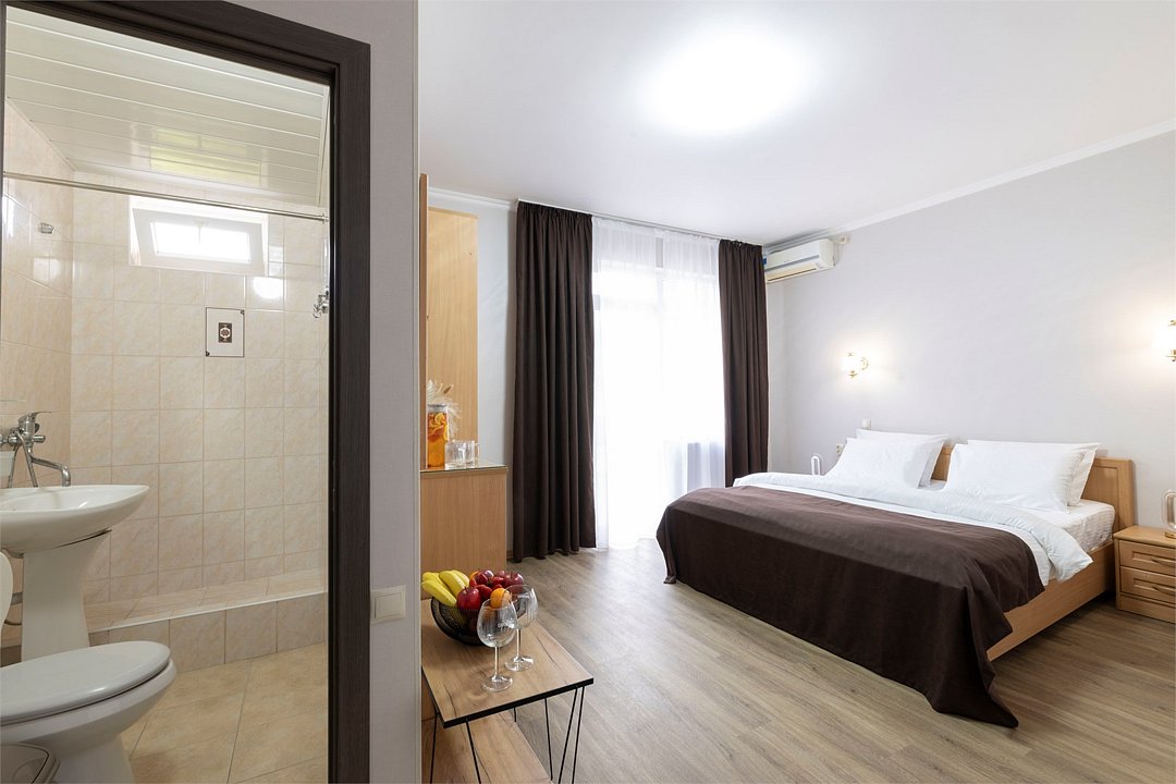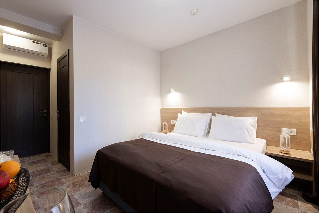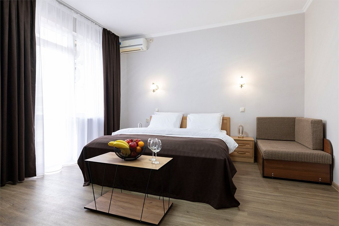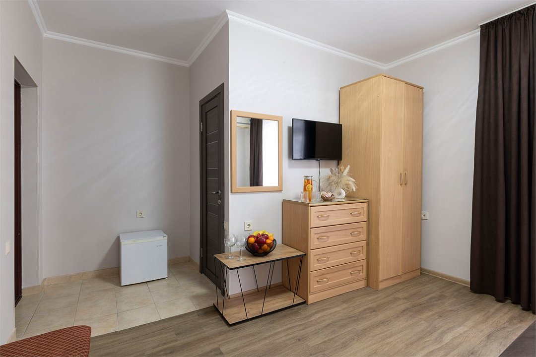 Двухместный номер «Стандарт» без балкона Комфортный и просторный вариант для отличного отдыха. Площадь номера: 15 кв.м Располагается на 1 этаже. Максимальное количество гостей: 2 взрослых + ребёнок до 3-х лет бесплатно на одной кровати с родителями. Оснащение номера: - кровать размера king-size - две прикроватные тумбочки, шкаф для одежды, комод, зеркало, журнальный столик - телевизор, холодильник, кондиционер, фен - вид во двор - полностью оборудованная ванная комната: душ, туалет, тапочки, набор полотенец, халат, туалетно - косметические принадлежности (мыло, шампунь, гель для душа, туалетная бумага).Услуги и удобства
