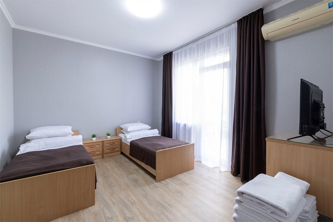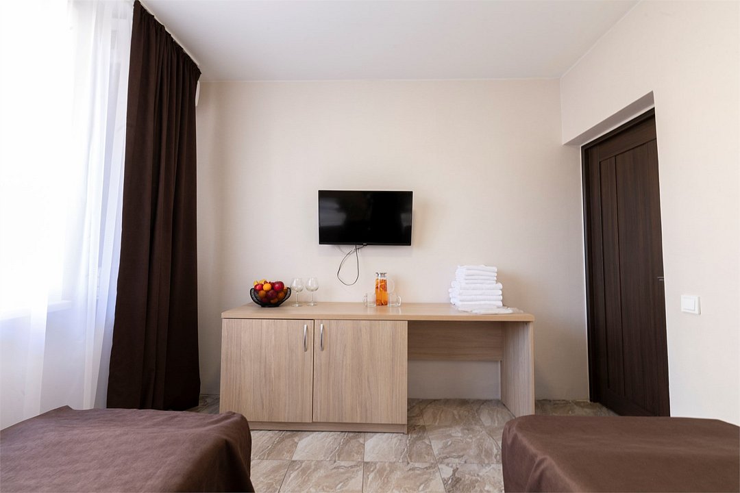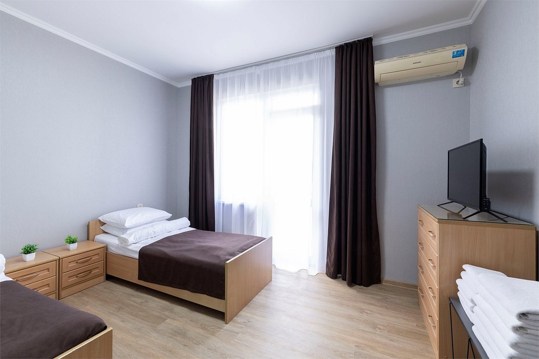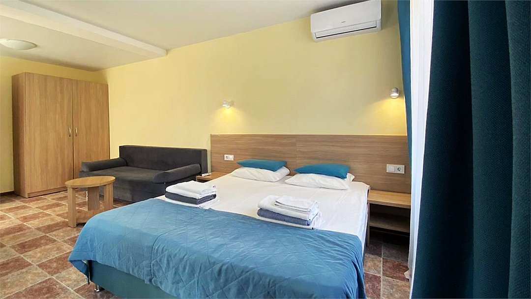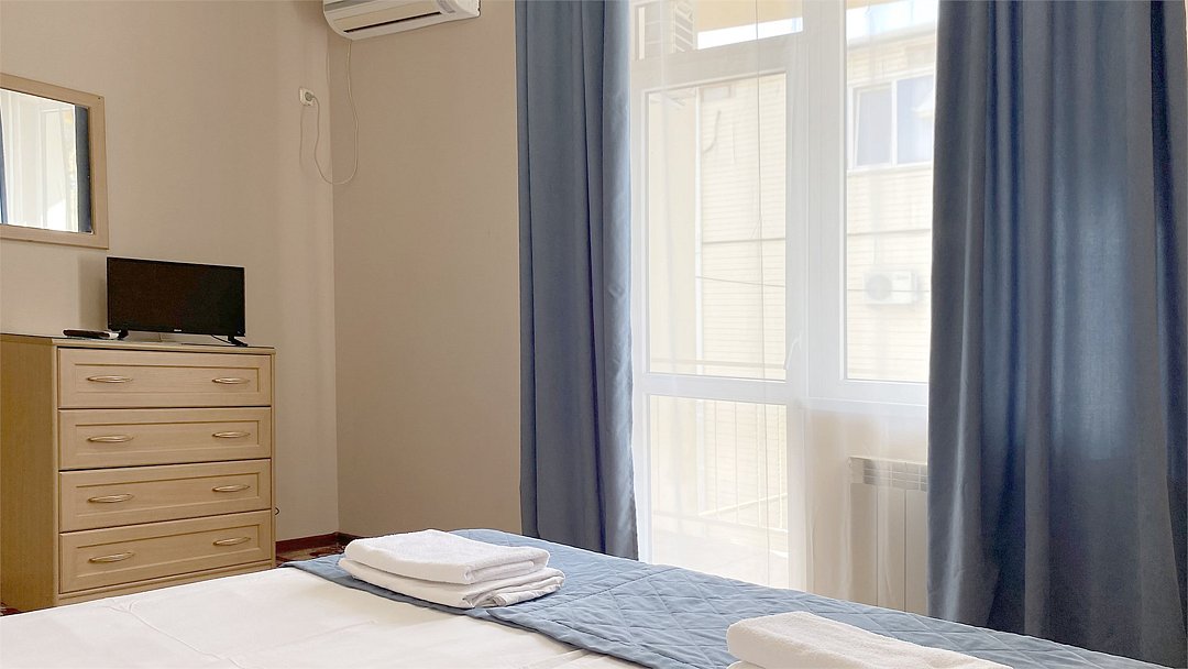 Двухкомнатный семейный номер Комфортный и просторный вариант для отличного отдыха. Площадь номера: 35 кв.м. Располагается на 1 этаже. Максимальное количество гостей: 4 взрослых + ребёнок до 3-х лет бесплатно на одной кровати с родителями. Оснащение номера: - двуспальная кровать + две односпальных кровати - четыре прикроватные тумбочки, шкаф для одежды, комод, зеркало, журнальный столик - два телевизора, холодильник, два кондиционера, фен - вид во двор/на улицу - полностью оборудованная ванная комната: душ, туалет, тапочки, набор полотенец, халат, туалетно - косметические принадлежности (мыло, шампунь, гель для душа, туалетная бумага).Услуги и удобства